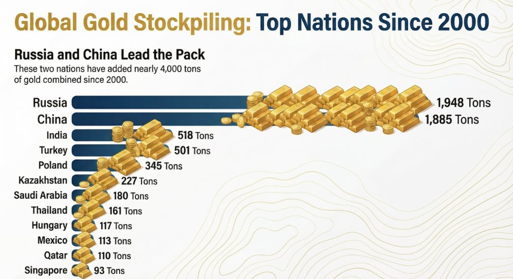 Theo thống kê của Visual Capitalist tổng hợp dưa trên dữ liệu của IMF, WB, WGC và các NHTW, Nga dẫn đầu các quốc gia trong việc bổ sung dự trữ vàng kể từ năm 2000, với mức tăng 1.948 tấn lên hơn 2.330 tấn tính đến 2024.