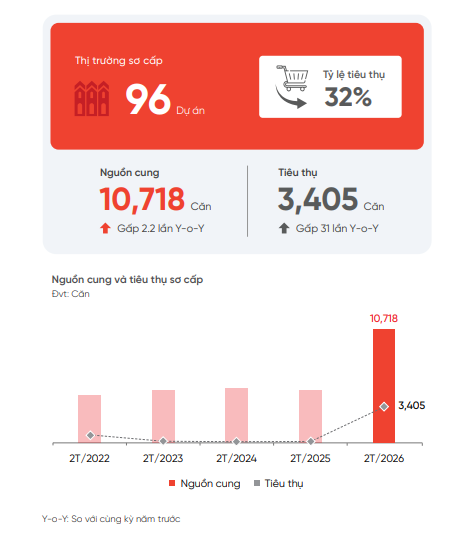 Trong đó, nguồn cung tăng 2,2 lần và lượng tiêu thụ sơ cấp tăng gần 31 lần so với cùng kỳ năm 2025.
