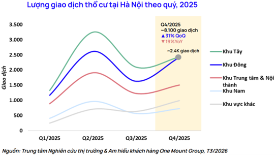 Theo báo cáo được tổng hợp từ Trung tâm Nghiên cứu thị trường và Am hiểu khách hàng One Mount Group, năm 2025, thị trường bất động sản Hà Nội ghi nhận khoảng 109.000 giao dịch. Trong đó, căn hộ chung cư tiếp tục là loại hình dẫn dắt thị trường, chiếm 63% tổng giao dịch, thổ cư chiếm khoảng 25% thị phần, phần còn lại thuộc về thấp tầng và các loại hình khác.