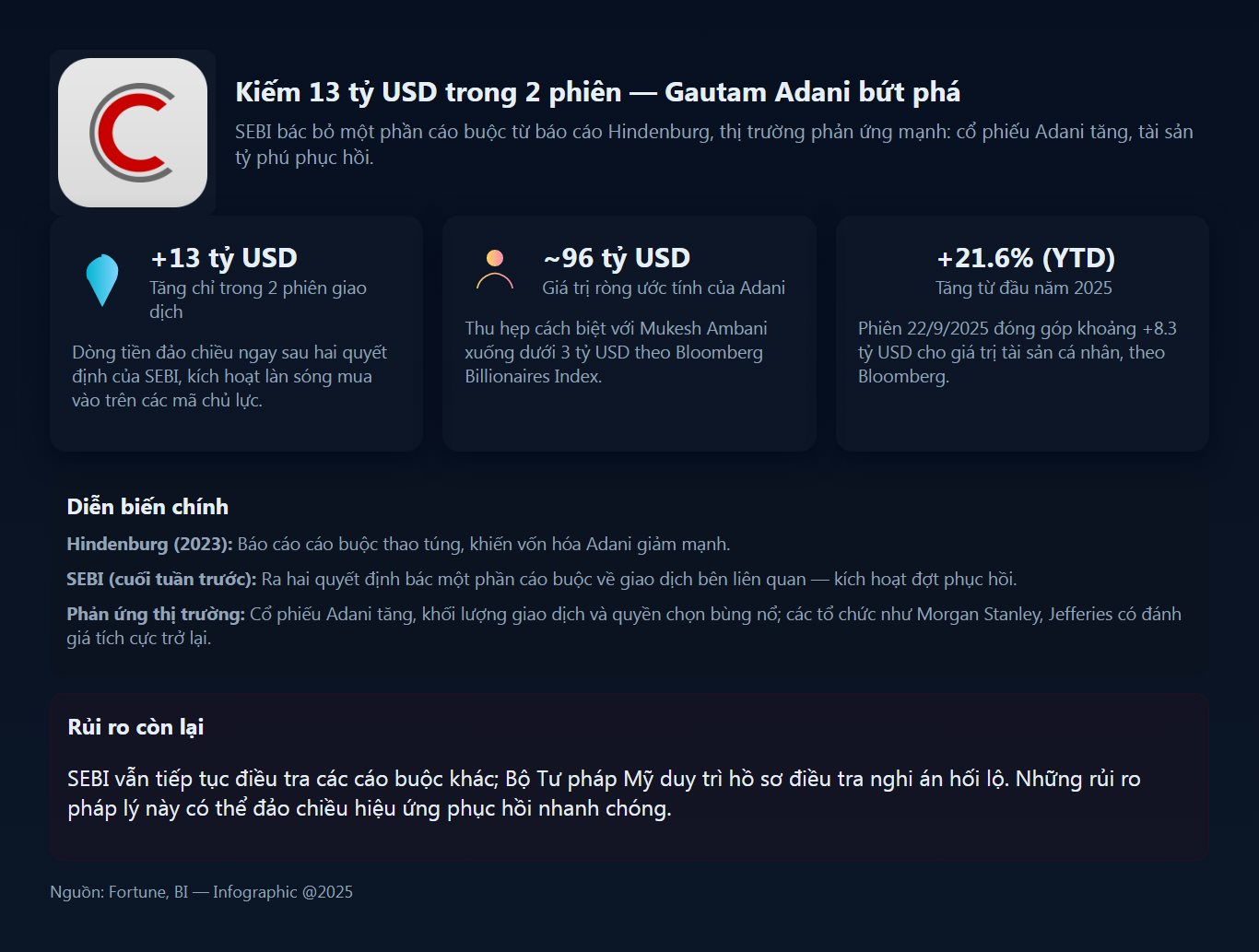 Theo Bloomberg Billionaires Index, chỉ riêng trong phiên 22/9/2025, giá trị tài sản của Adani tăng thêm 8,3 tỷ USD, đưa mức tăng từ đầu năm 2025 lên 21,6%.