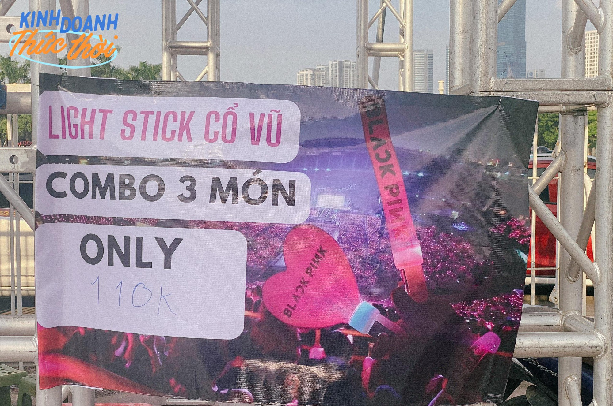 Một số vật phẩm khác phục vụ người hâm mộ "đu" BLACKPINK cũng bắt đầu được nhiều bạn mang ra sân. Theo ghi nhận, lượng người mua khá ít nhưng cũng không phải không có người quan tâm. Người bán cũng tiết lộ chỉ làm một số lượng nhỏ bởi dự đoán được tình hình chung: "Bình thường mình vẫn bán online qua fanpage, phải gom một số lượng nhất định mới đặt sản xuất. Những bạn nào cần mua sẽ tự tìm đến qua các hội nhóm đu Kpop. Cho nên kể cả không bán hết 50 chiếc quạt, gậy phát sáng và card này thì mình lại đem về rao", bạn K.L cho hay.