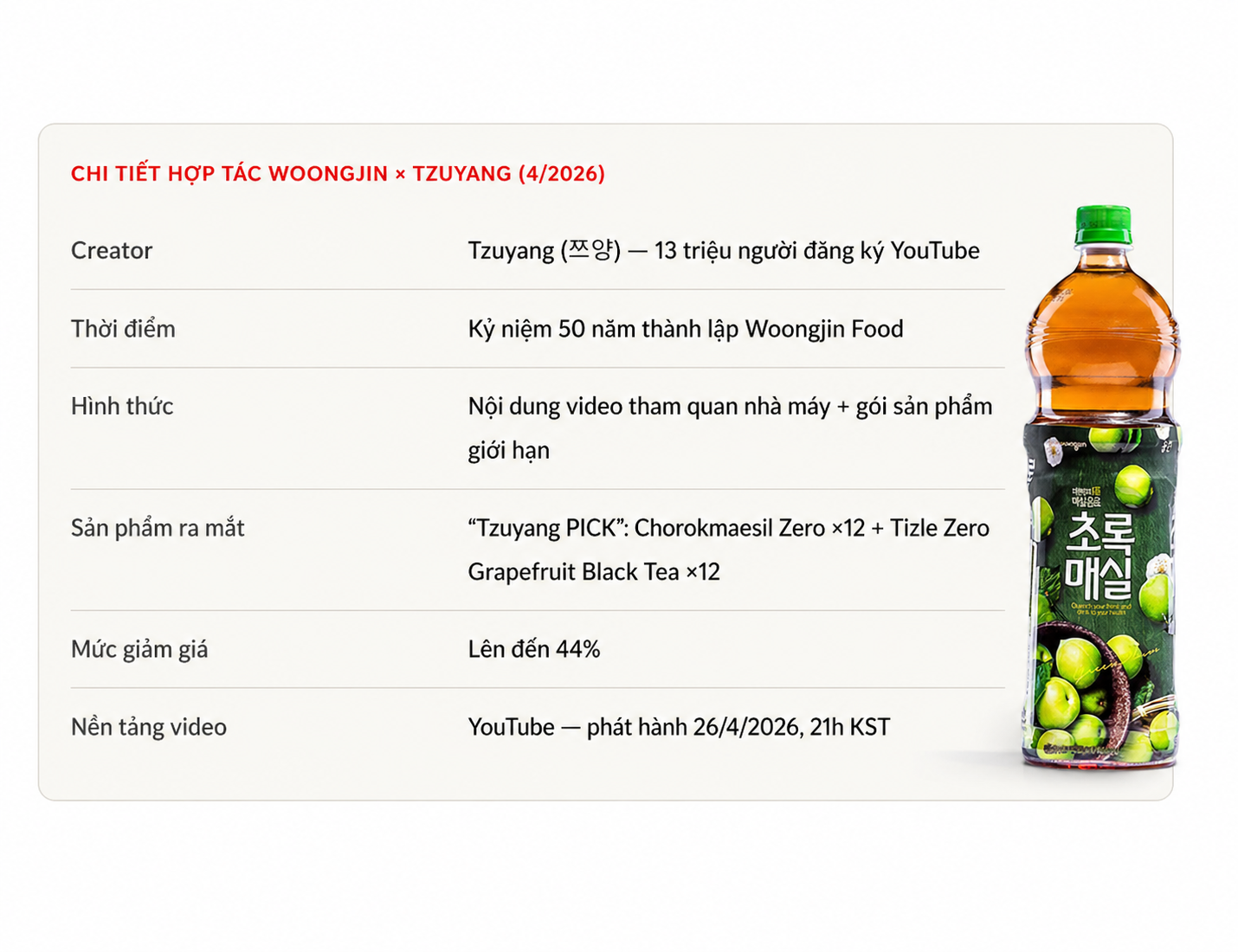 "Năm nay là dịp kỷ niệm 50 năm thành lập Woongjin Food. Chúng tôi đã lên kế hoạch cho một cuộc gặp đặc biệt với Tzuyang người đã yêu thích Chorokmaesil trong suốt nhiều năm qua. Chúng tôi sẽ tiếp tục mang đến những trải nghiệm thương hiệu mới thông qua các hợp tác đa dạng." Đại diện Woongjin Food (Smart Economy, tháng 4/2026).