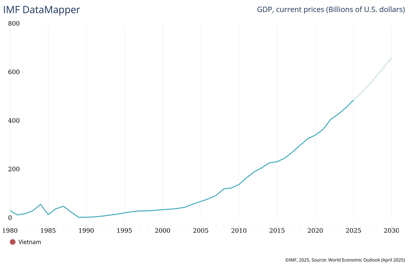 Quy mô GDP Việt Nam trong hơn 40 năm qua, theo dữ liệu của Quỹ Tiền tệ Quốc tế (IMF).
