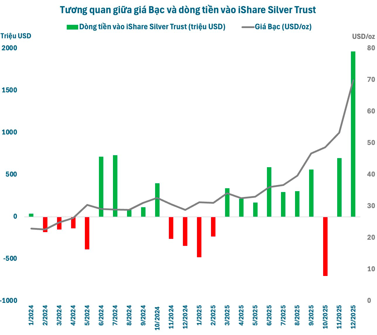 Các quỹ Bạc mua mạnh tay cũng là một yếu tố thúc đẩy giá Bạc tăng phi mã thời gian qua. Từ đầu năm 2025 đến nay, giá kim loại này đã tăng 140% qua đó lập đỉnh mới gần 70 USD/oz. Đằng sau biến động này là sự mất cân đối cung – cầu và tình trạng cạn kiệt kho dự trữ, dẫn tới cuộc đua gom hàng khốc liệt giữa các cường quốc.
