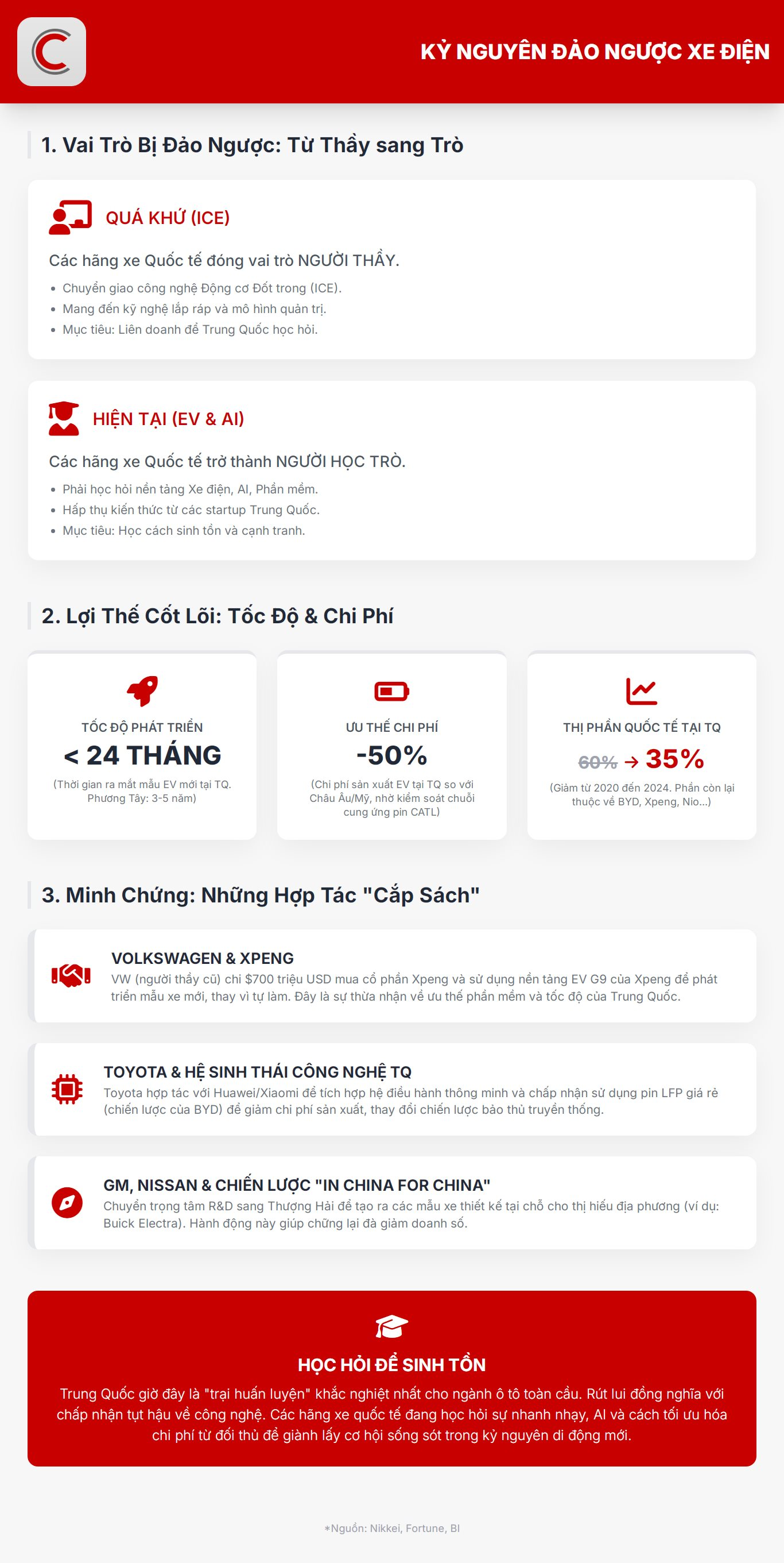 Thế nhưng trong kỷ nguyên xe điện (EV), trí tuệ nhân tạo (AI) và kết nối số, vị thế đã đảo ngược. Giờ đây, Trung Quốc đã trở thành cường quốc công nghệ mới, buộc những gã khổng lồ toàn cầu phải cắp sách tới chính thị trường mà họ từng thống trị để học hỏi cách sinh tồn.