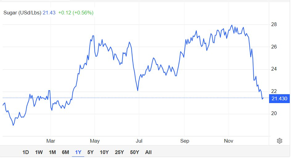 Diễn biến giá đường trong 1 năm qua (Nguồn: Trading Economics).