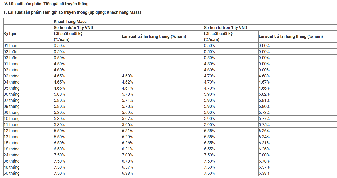 Các kỳ hạn từ 6 - 11 tháng được niêm yết ở mức 4,9%/năm, trong khi kỳ hạn 12 tháng đạt 6,6%/năm và giữ nguyên tại các kỳ hạn 13, 15 và 18 tháng. Nhóm kỳ hạn dài từ 24 tháng trở lên tiếp tục duy trì mức 7,5%/năm.