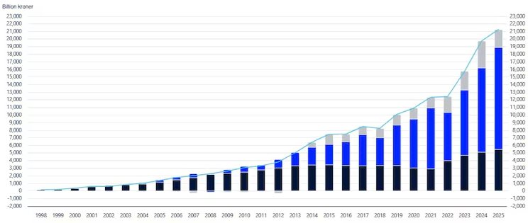 Diễn biến tăng trưởng của quỹ phản ánh rất rõ sự chuyển dịch này. Từ một quỹ gần như “trống” vào cuối những năm 1990, giá trị chỉ mới ở mức vài trăm tỷ kroner, quỹ nhanh chóng vượt mốc 1.000 tỷ kroner vào giữa những năm 2000. Đến năm 2013, con số này đã đạt khoảng 5.000 tỷ kroner. Nhưng giai đoạn tăng trưởng mạnh nhất lại diễn ra trong thập kỷ gần đây, khi thị trường tài chính toàn cầu bước vào chu kỳ tăng dài, đặc biệt là sự bùng nổ của cổ phiếu công nghệ.