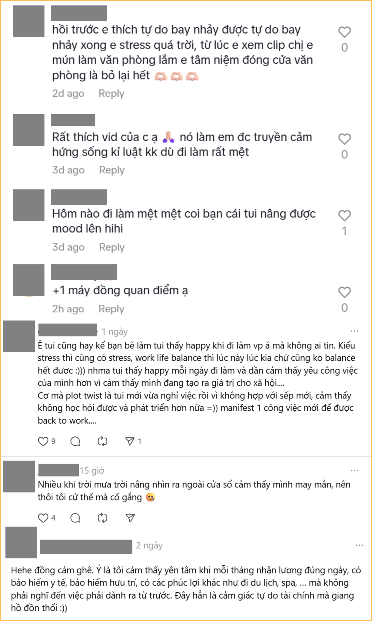 “Nhiều người cứ chê đi làm văn phòng áp lực này kia, nhưng ít ai nói về cảm giác yên tâm khi có thu nhập ổn định, có lịch làm việc rõ ràng và có lịch trình sinh hoạt hàng ngày cố định. Càng lớn mình càng thấm thía là chẳng có việc gì ra tiền mà không áp lực đâu, đến ở nhà bố mẹ nuôi vẫn còn thấy áp lực nữa mà, nên ai bảo mình không bước ra vùng an toàn thì mình kệ, chứ mãi mãi cũng chỉ muốn đi làm văn phòng thôi, không ham kinh doanh tự làm chủ chi hết” - Một bạn trẻ bình luận.