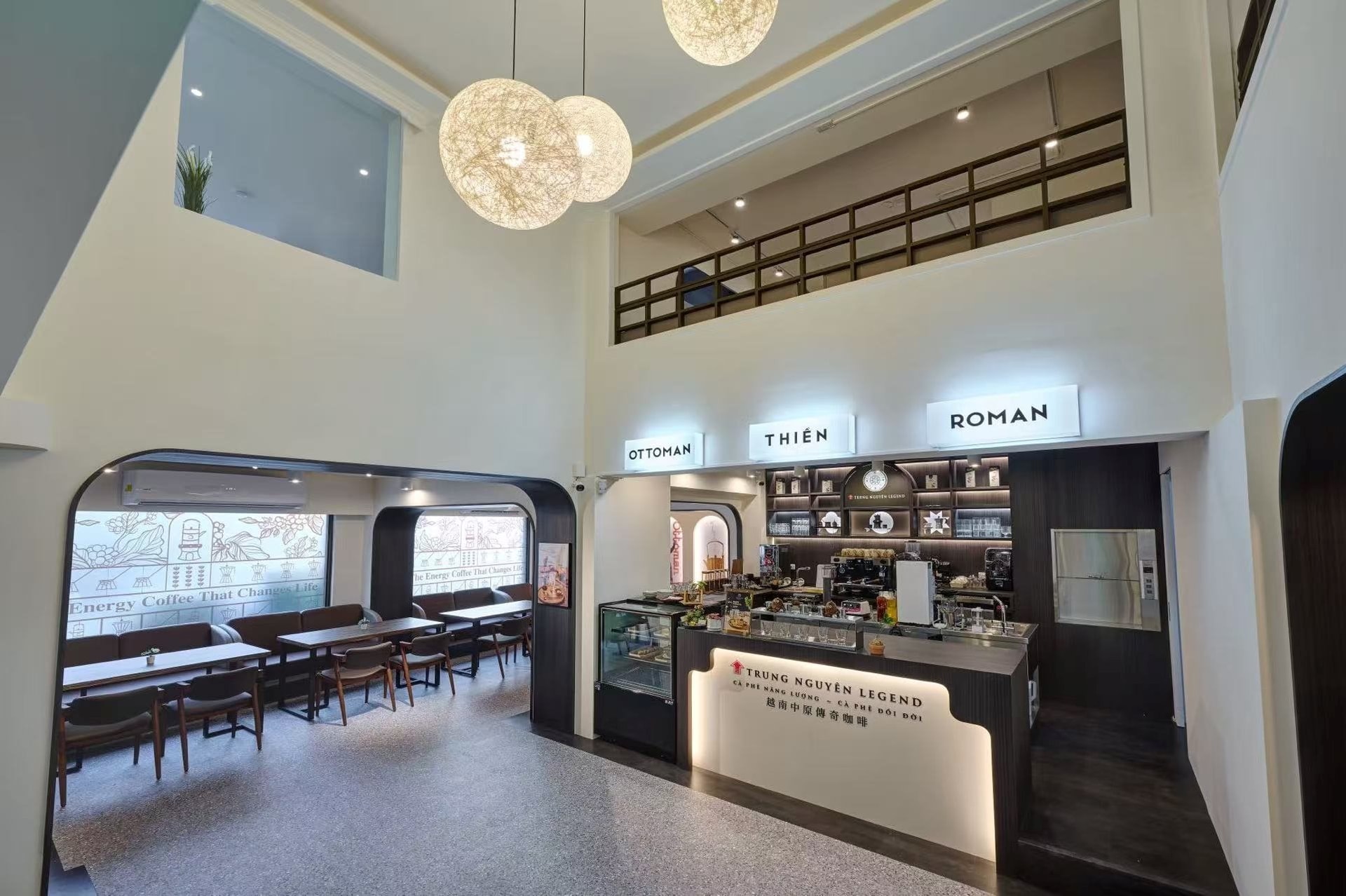 Bên trong, khách hàng sẽ được dẫn dắt qua ba nền văn minh cà phê – Ottoman, Roman và Thiền – tạo nên trải nghiệm đa tầng về thị giác, khứu giác và cảm xúc. Khu vực tầng 1 đặc biệt bố trí khu pha chế và trải nghiệm cảm quan, nơi khách có thể trực tiếp quan sát nghệ thuật pha cà phê phin Việt Nam truyền thống.