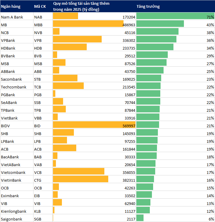 Đáng chú ý, năm 2025 ghi nhận nhiều ngân hàng "bùng nổ" về quy mô. Trong đó đáng chú ý nhất là Nam A Bank.