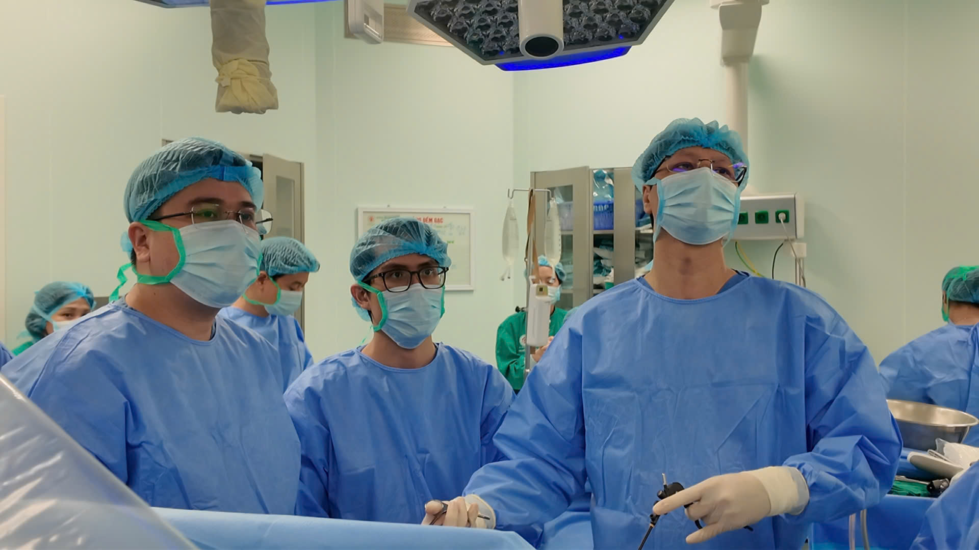 Ca phẫu thuật diễn ra trong 7 giờ, với sự phối hợp của nhiều chuyên khoa. Người bố được phẫu thuật nội soi để lấy mảnh gan phải – phương pháp ít xâm lấn, giúp rút ngắn thời gian hồi phục.