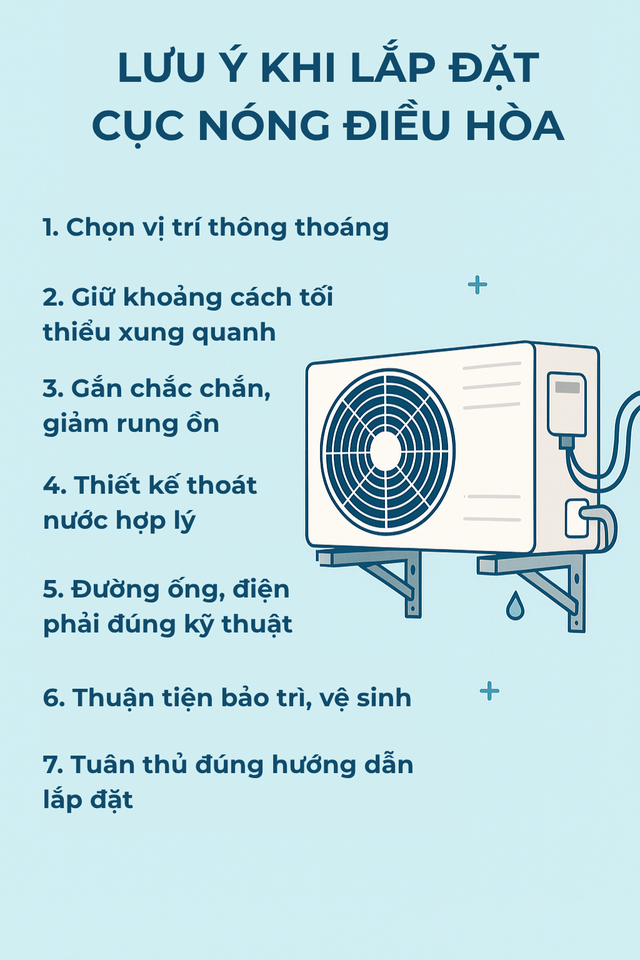Những vị trí này là hợp lý, giúp hơi nóng được tản ra ngoài một cách tuyệt đối, không ảnh hưởng tới nhiệt độ của ngôi nhà. Tuy nhiên các chuyên gia nhận định, có những lưu ý đặc biệt để cục nóng điều hòa vừa được lắp đặt đúng cách, vừa đảm bảo tuổi thọ và hiệu quả hoạt động.