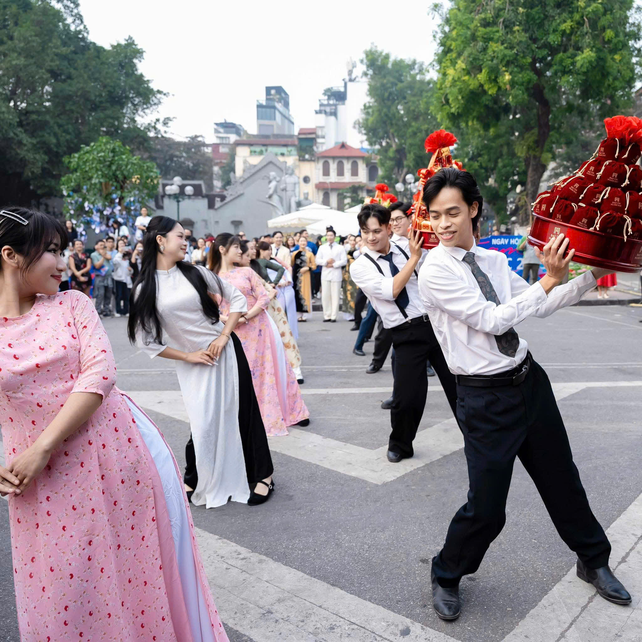 Điểm nhấn đặc biệt của tuyến diễu hành là hình ảnh đoàn rước dâu thời Nguyễn chầm chậm tiến qua cung đường từ Quảng trường Đông Kinh Nghĩa Thục đến Hàng Khay. Giữa tiếng nhạc lễ vang vọng, tân lang – tân nương sánh bước, quan viên chỉnh tề, lễ tráp đủ nghi thức, tất cả tái hiện trọn vẹn nét trang nhã của hôn lễ Việt xưa.