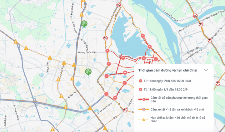 Theo thông báo, toàn bộ phương án phân luồng, cấm và hạn chế phương tiện sẽ bắt đầu từ 18h ngày 1/9 và kéo dài đến 15h ngày 2/9. Trong thời gian này, nhiều tuyến phố trọng điểm ở khu vực trung tâm Thủ đô sẽ bị cấm triệt để các phương tiện lưu thông, ngoại trừ xe phục vụ Lễ kỷ niệm, xe mang phù hiệu bảo vệ và các phương tiện được cấp phép đặc biệt.