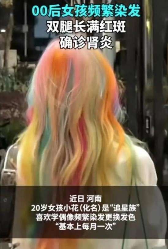 Henan TV (Đài truyền hình Hà Nam) mới đây đưa tin, Hua, 20 tuổi (sống tại Hà Nam, Trung Quốc) có thói quen thay đổi màu tóc mỗi tháng để bắt chước ngôi sao yêu thích. Gần đây, Hua gặp các triệu chứng như xuất hiện ban đỏ ở hai chân, đau khớp và đau bụng. Khi đi khám, cô được chẩn đoán viêm thận.