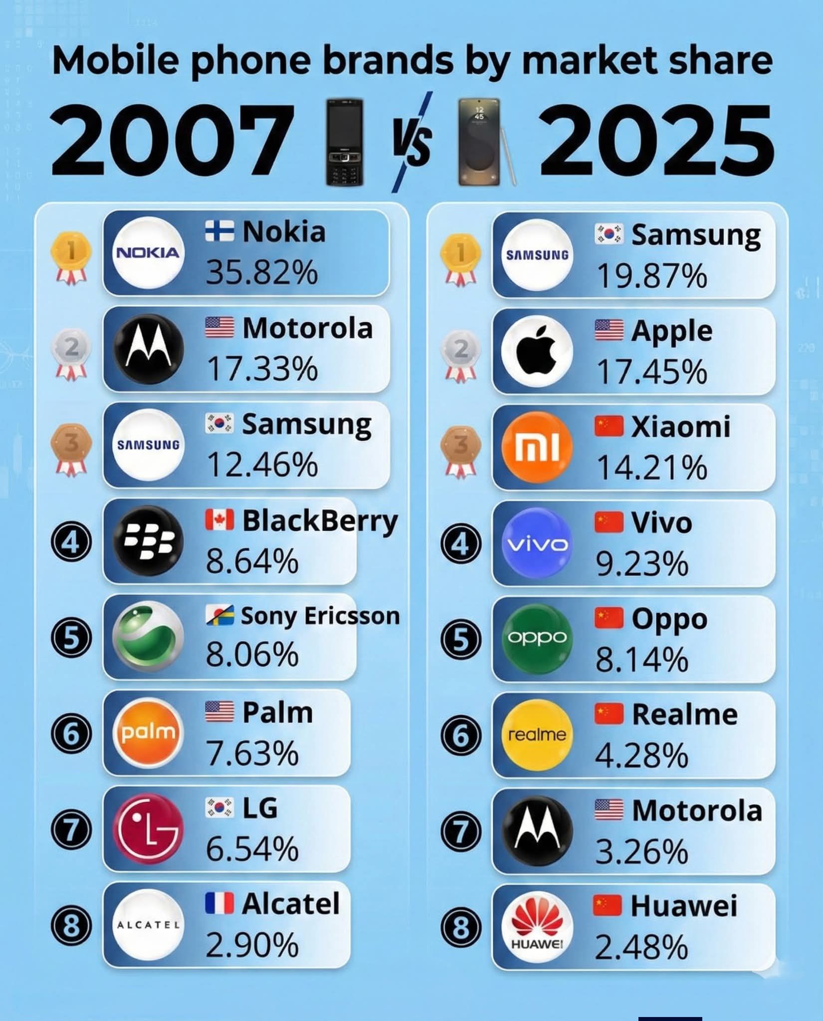 Thị phần điện thoại năm 2007 và 2025. Không có gì khẳng định bảng xếp hạng này vẫn sẽ giữ nguyên trong 10 năm tới.