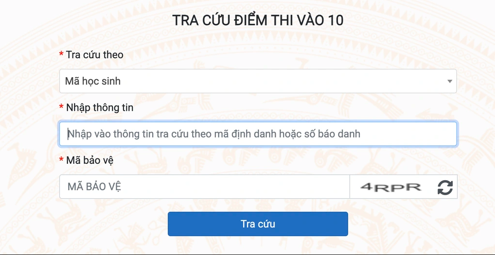 Tại ô "Nhập thông tin", thí sinh/phụ huynh cần nhập số tương ứng với lựa chọn Mã học sinh hoặc Số báo danh. Con số mã học sinh hoặc số báo danh, thí sinh/phụ huynh có thể xem lại tại phiếu báo thi.