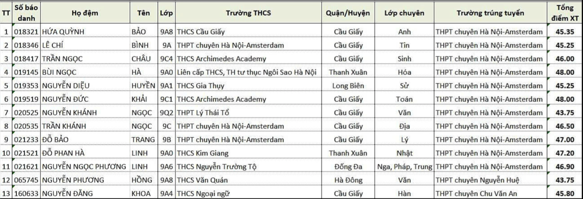 Danh sách thủ khoa vào các lớp 10 chuyên của Hà Nội như sau: