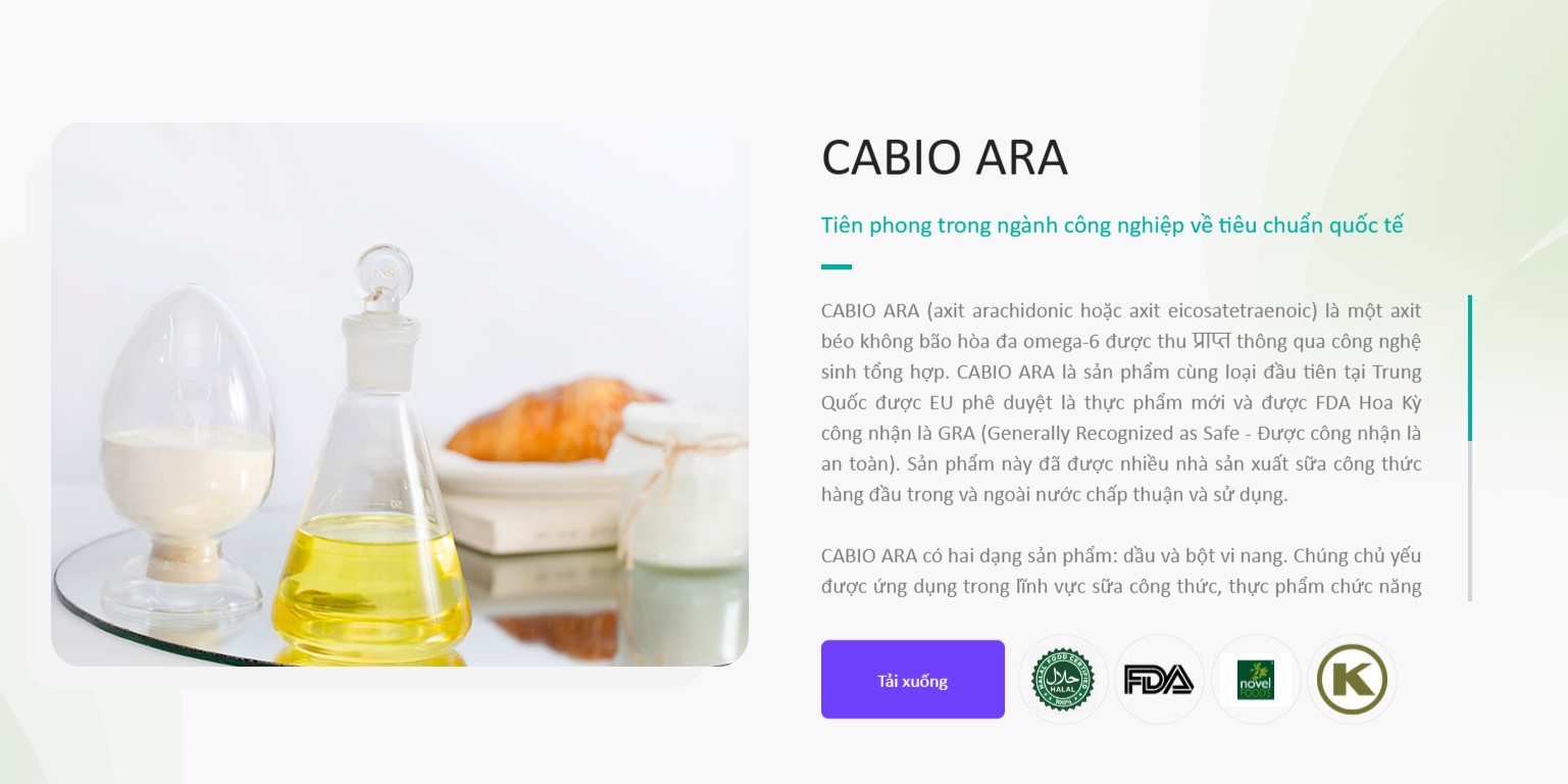 Cabio Biotech có trụ sở tại Vũ Hán, tỉnh Hồ Bắc, Trung Quốc. Trong giới nguyên liệu thực phẩm, đây không phải là một cái tên nhỏ lẻ. Họ sử dụng công nghệ lên men vi sinh vật để chiết xuất ARA, một quy trình đòi hỏi sự kiểm soát vi sinh cực kỳ nghiêm ngặt.