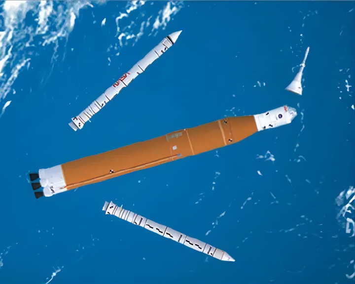 (2) Tên lửa SLS tách bỏ các tầng đẩy rắn, lớp bảo vệ và hệ thống thoát hiểm trong giai đoạn Ascent Jettison. (Nguồn: Roen Kelly)
