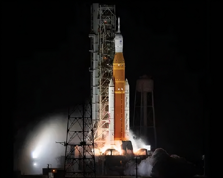 (1) Tên lửa SLS trên bẹ phóng từ Trung tâm Vũ trụ Kennedy, mở đầu hành trình Artemis 2 bay quanh Mặt trăng. (Nguồn: NASA)