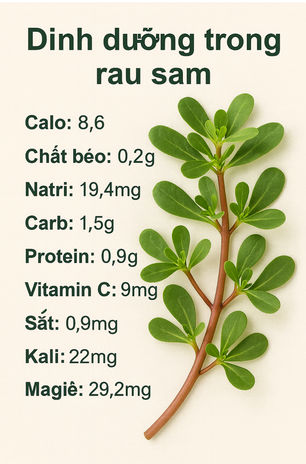 Rau sam còn chứa nhiều vitamin A, C, các vitamin nhóm B, carotenoid và các khoáng chất như magiê, canxi, kali, sắt. Nhờ hàm lượng chất chống oxy hóa cao, nhiều nghiên cứu đã xem xét vai trò của rau sam trong việc giảm stress oxy hóa - yếu tố liên quan đến lão hóa và nhiều bệnh lý mạn tính.