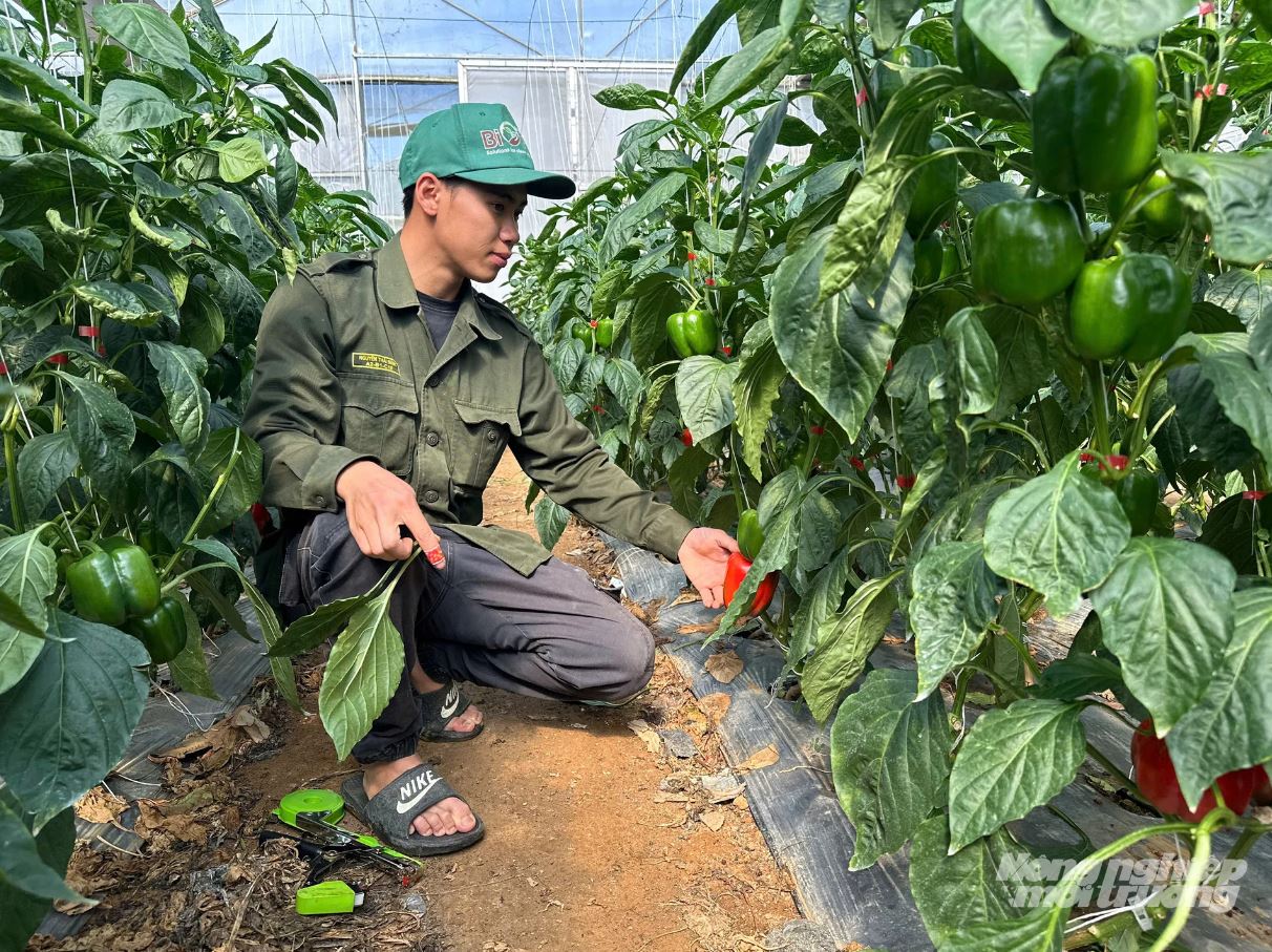 Anh Trịnh Việt Cường thu hoạch ớt chuông. (Ảnh: Hải Tiến/báo Nông nghiệp và Môi trường)