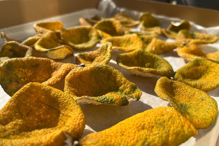 Vỏ cam sau khi phơi bên ngoài cần lật lại để phơi bên trong. (Ảnh: Xiachufang)