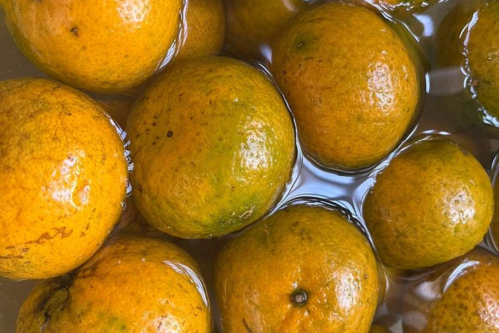 - Cam mua về rửa sạch, ngâm trong nước muối để làm sạch lớp vỏ. Sau đó để ráo nước.