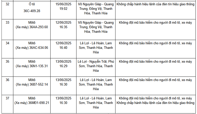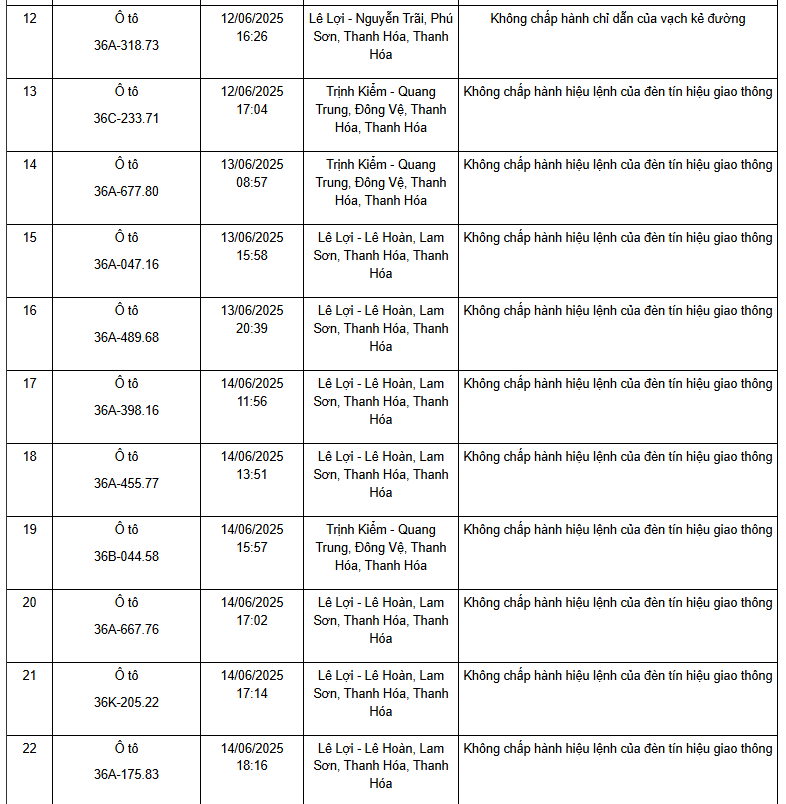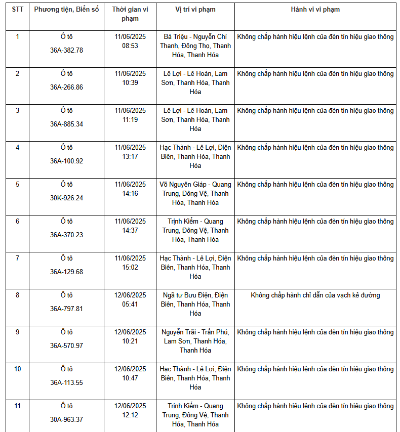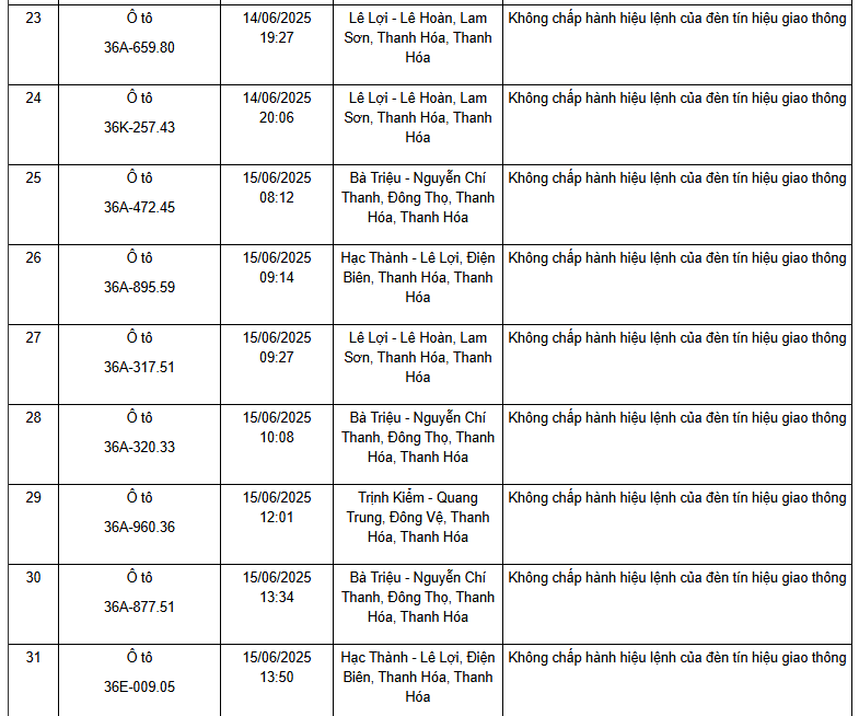 Công an tỉnh Thanh Hóa thông báo, từ ngày 11/6/2025 đến ngày 15/6/2025, thông qua thiết bị kỹ thuật nghiệp vụ, các tổ công tác của phòng CSGT đã phát hiện, ghi nhận bằng hình ảnh các trường hợp phương tiện không chấp hành hiệu lệnh của đèn tín hiệu giao thông. Danh sách biển số vi phạm cụ thể như sau: