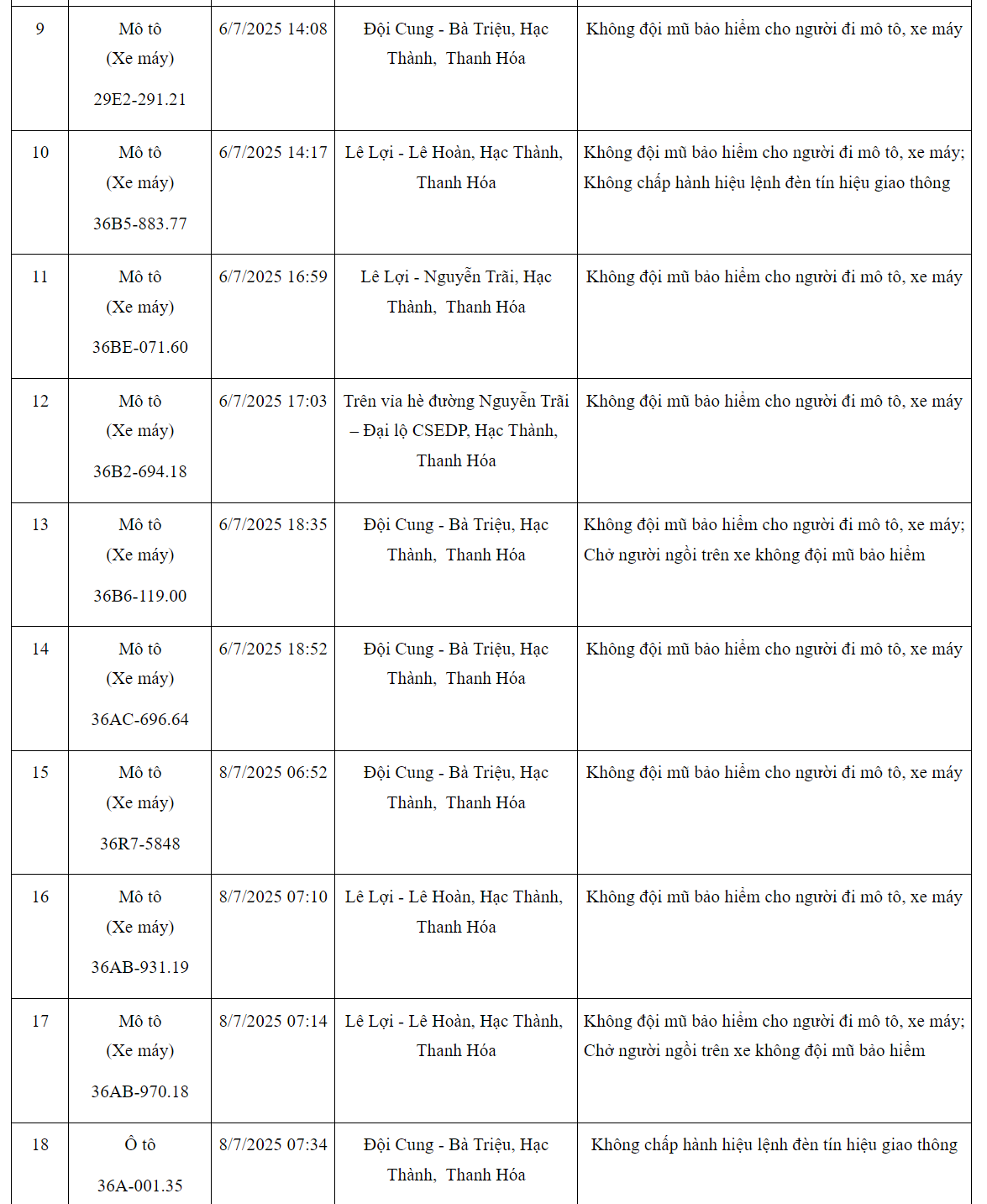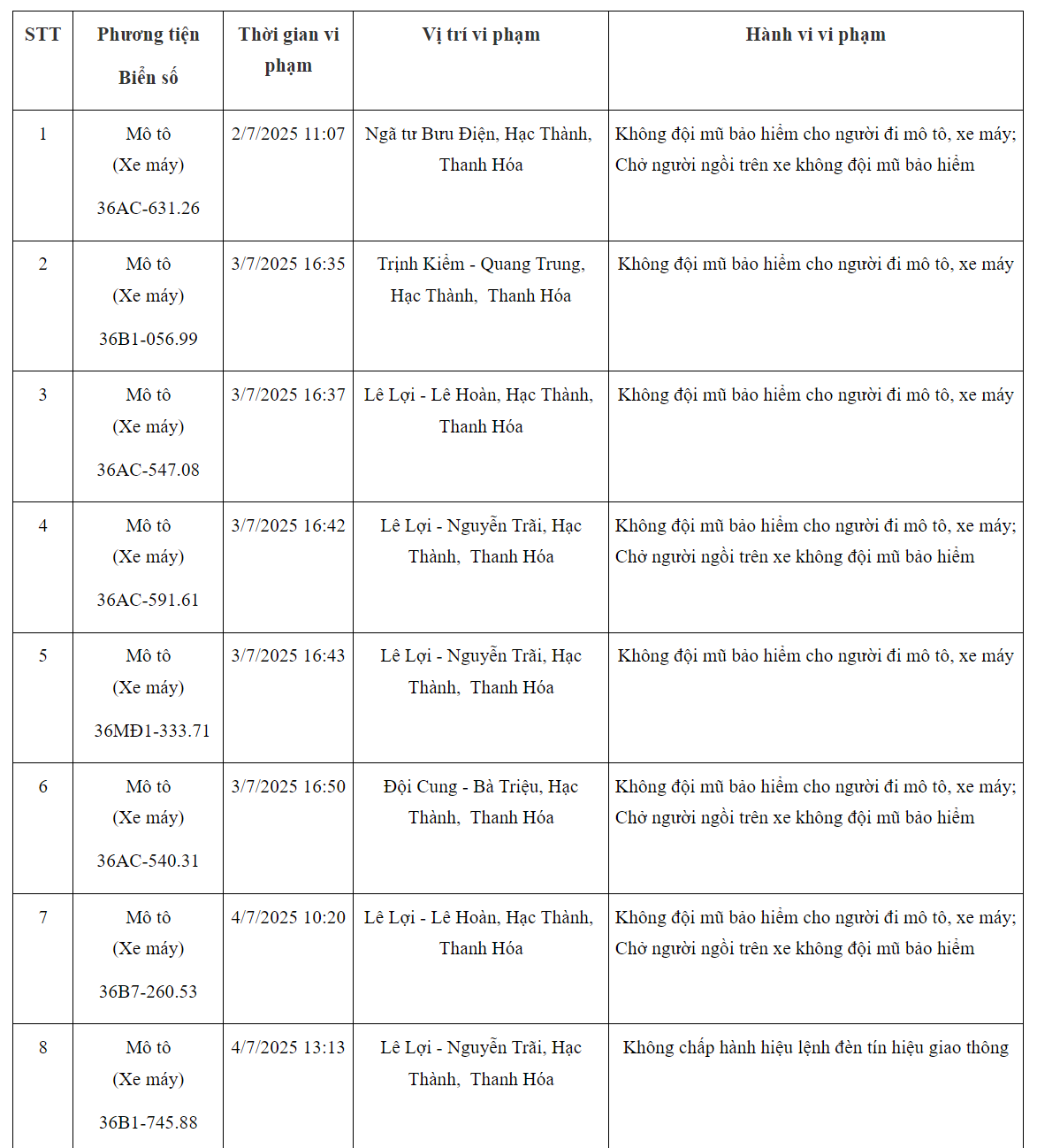 Phòng CSGT Công an tỉnh Thanh Hóa đã xác định thêm nhiều trường hợp xe máy vi phạm trật tự an toàn giao thông bị phạt nguội trong những ngày đầu tháng 7/2025.