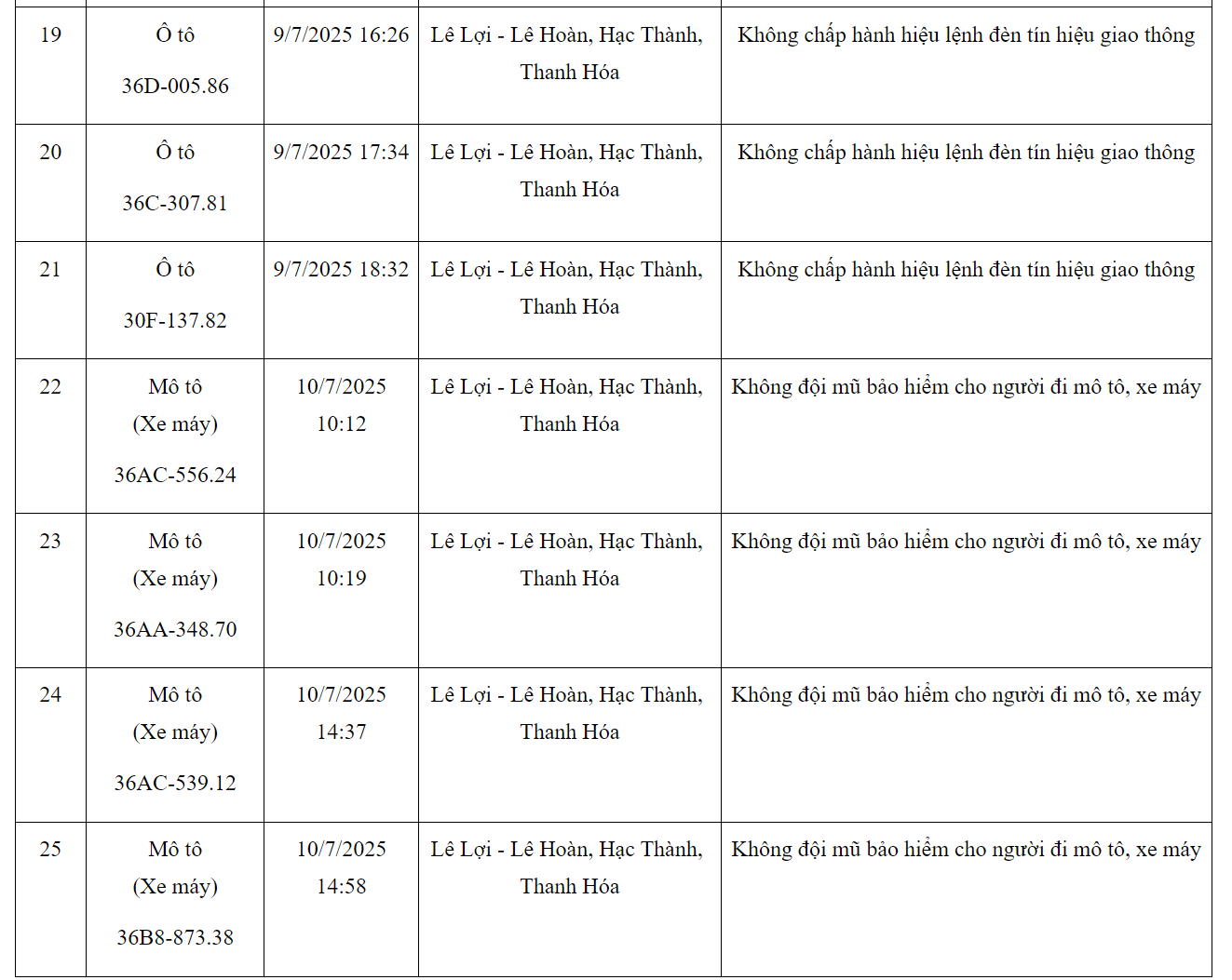 Theo thông báo mới nhất từ Phòng Cảnh sát giao thông Công an tỉnh Thanh Hóa thông báo, từ ngày 01/7/2025 đến ngày 10/7/2025, thông qua thiết bị kỹ thuật nghiệp vụ, các tổ công tác của phòng CSGT đã phát hiện, ghi nhận bằng hình ảnh các trường hợp phương tiện không chấp hành hiệu lệnh của đèn tín hiệu giao thông. Danh sách biển số vi phạm cụ thể như sau:
