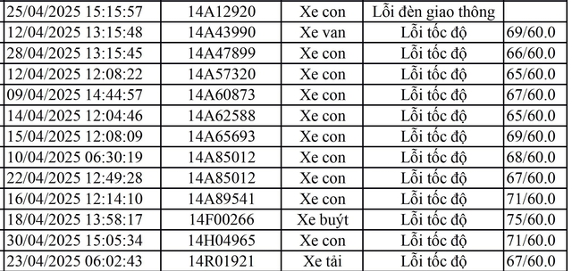 Theo danh sách các trường hợp ô tô, xe máy vi phạm tín hiệu đèn giao thông và chạy quá tốc độ từ ngày 01-30/4/2025 do Công an tỉnh Vĩnh Phúc cũ (nay thuộc tỉnh Phú Thọ) ghi lại: Có một số ô tô mang biển số xe Quảng Ninh đã vi phạm lỗi đèn giao thông và lỗi tốc độ như sau.