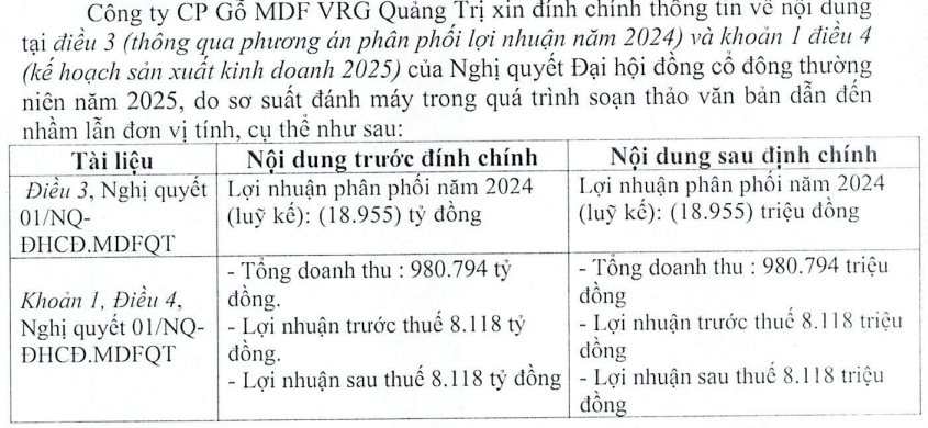 Mới đây, CTCP Gỗ MDF VRG Quảng Trị (mã: MDF) công bố văn bản đính chính một số nội dung tại Nghị quyết ĐHĐCĐ thường niên 2025 do sơ suất đánh máy trong quá trình soạn thảo văn bản dẫn đến nhầm lẫn đơn vị tính, khiến các chỉ tiêu kinh doanh tăng vọt so với quy mô doanh nghiệp.