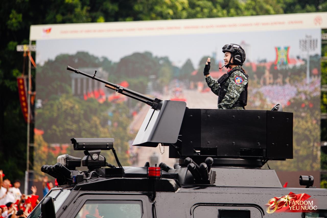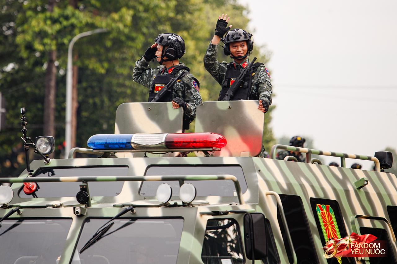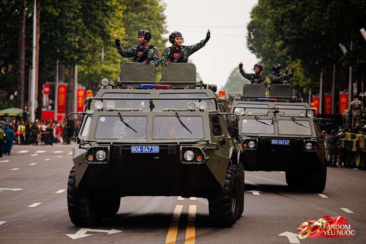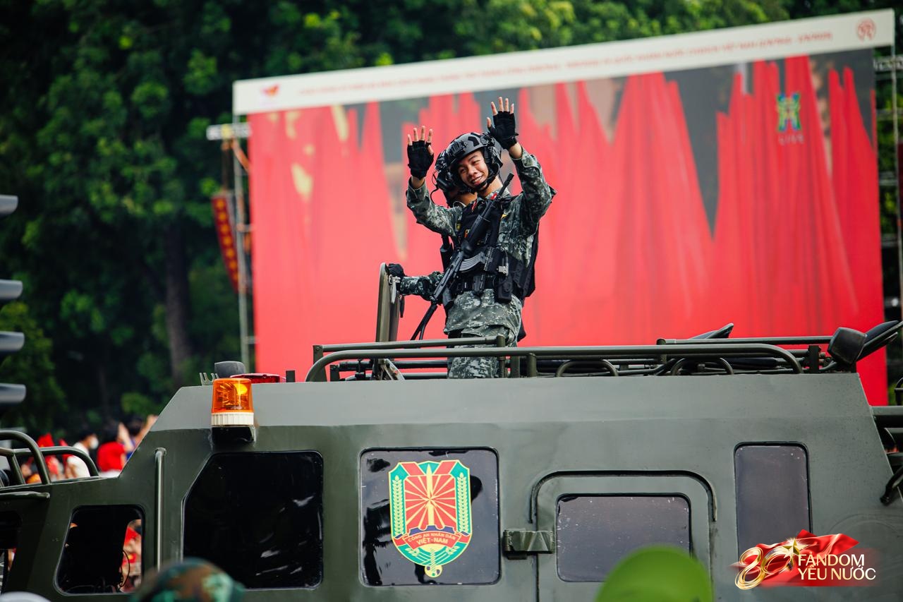 Các chiến sĩ trên dàn khí tài hiện đại nghiêm trang chào theo điều lệnh, rồi vẫy tay và nở nụ cười đáp lại người dân. Tiếng reo hò hòa cùng ánh mắt háo hức của khán giả, tạo nên khoảnh khắc thân thiện nhưng vẫn uy nghiêm, thể hiện tình quân dân gắn bó.