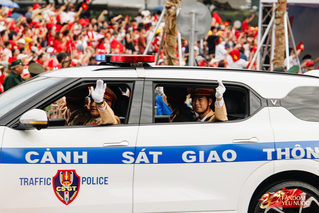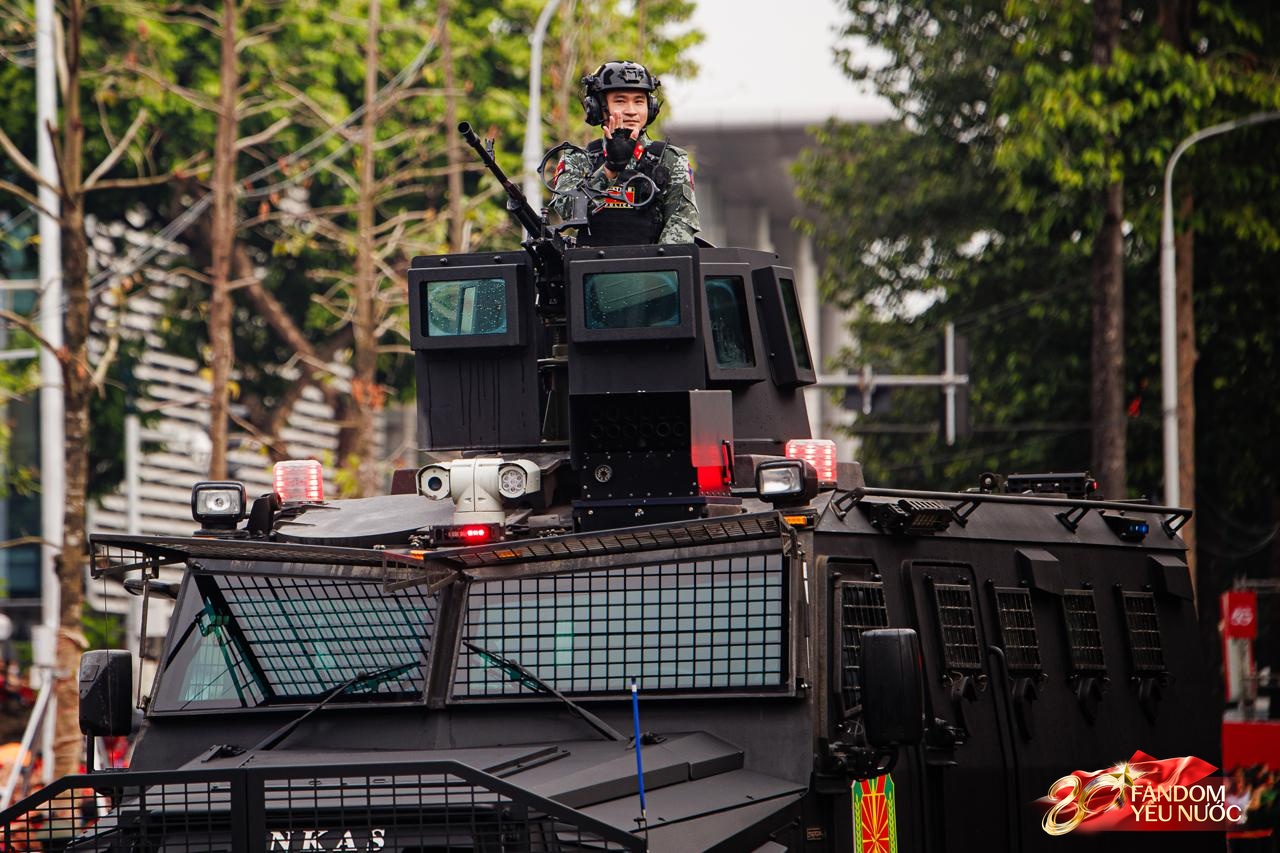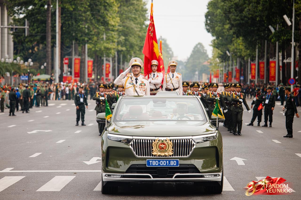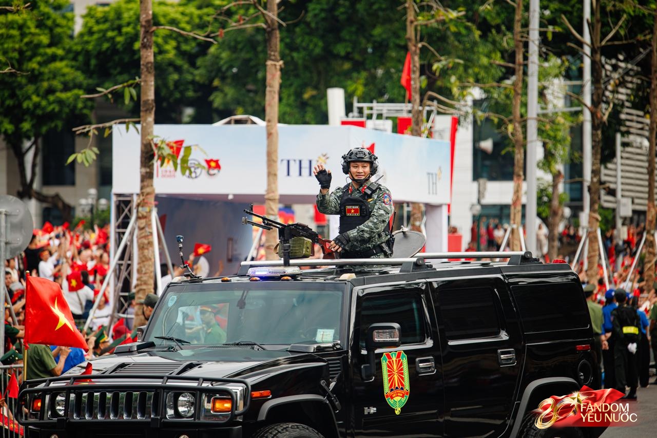 Các chiến sĩ trên dàn khí tài hiện đại nghiêm trang chào theo điều lệnh, rồi vẫy tay và nở nụ cười đáp lại người dân. Tiếng reo hò hòa cùng ánh mắt háo hức của khán giả, tạo nên khoảnh khắc thân thiện nhưng vẫn uy nghiêm, thể hiện tình quân dân gắn bó.