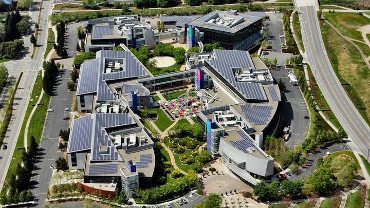 Trụ sở chính của Alphabet tại Mountain View, California, với hệ thống tấm pin năng lượng mặt trời trải rộng. (Nguồn: Getty Images)