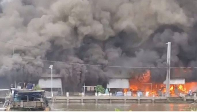 Hàng chục ki-ốt tại chợ Thanh Tùng, tỉnh Cà Mau cháy dữ dội, cột khói bốc cao hàng chục mét.