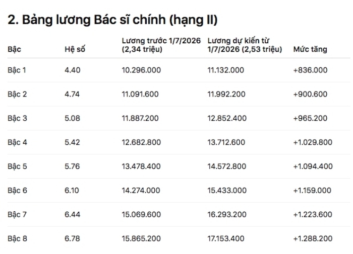 Nếu mức lương cơ sở tăng lên 2,53 triệu đồng/tháng, mức lương của bác sĩ từ 1/7/2026 cũng sẽ tăng tương ứng theo hệ số, được tính như sau: