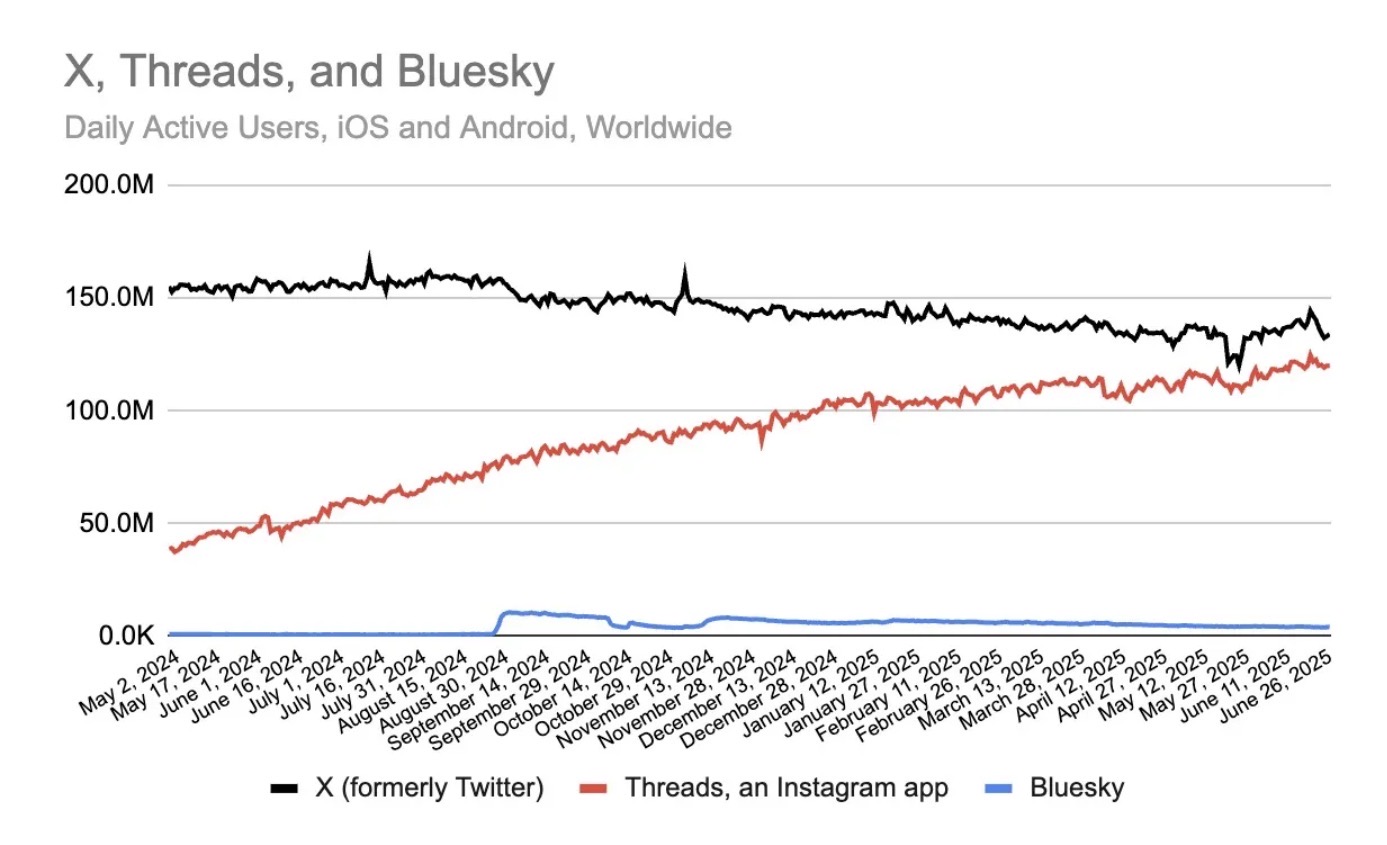 Theo dữ liệu từ công ty phân tích Similarweb, ứng dụng Threads của Instagram đã đạt tới 115,1 triệu người dùng hoạt động mỗi ngày trên iOS và Android vào tháng 6 năm 2025, tăng trưởng thần tốc 127,8% so với cùng kỳ năm ngoái. Trong khi đó, X – đứa con tinh thần của Elon Musk – vẫn giữ vị trí dẫn đầu với 132 triệu người dùng hàng ngày, nhưng lại ghi nhận mức sụt giảm 15,2% trong cùng khoảng thời gian.