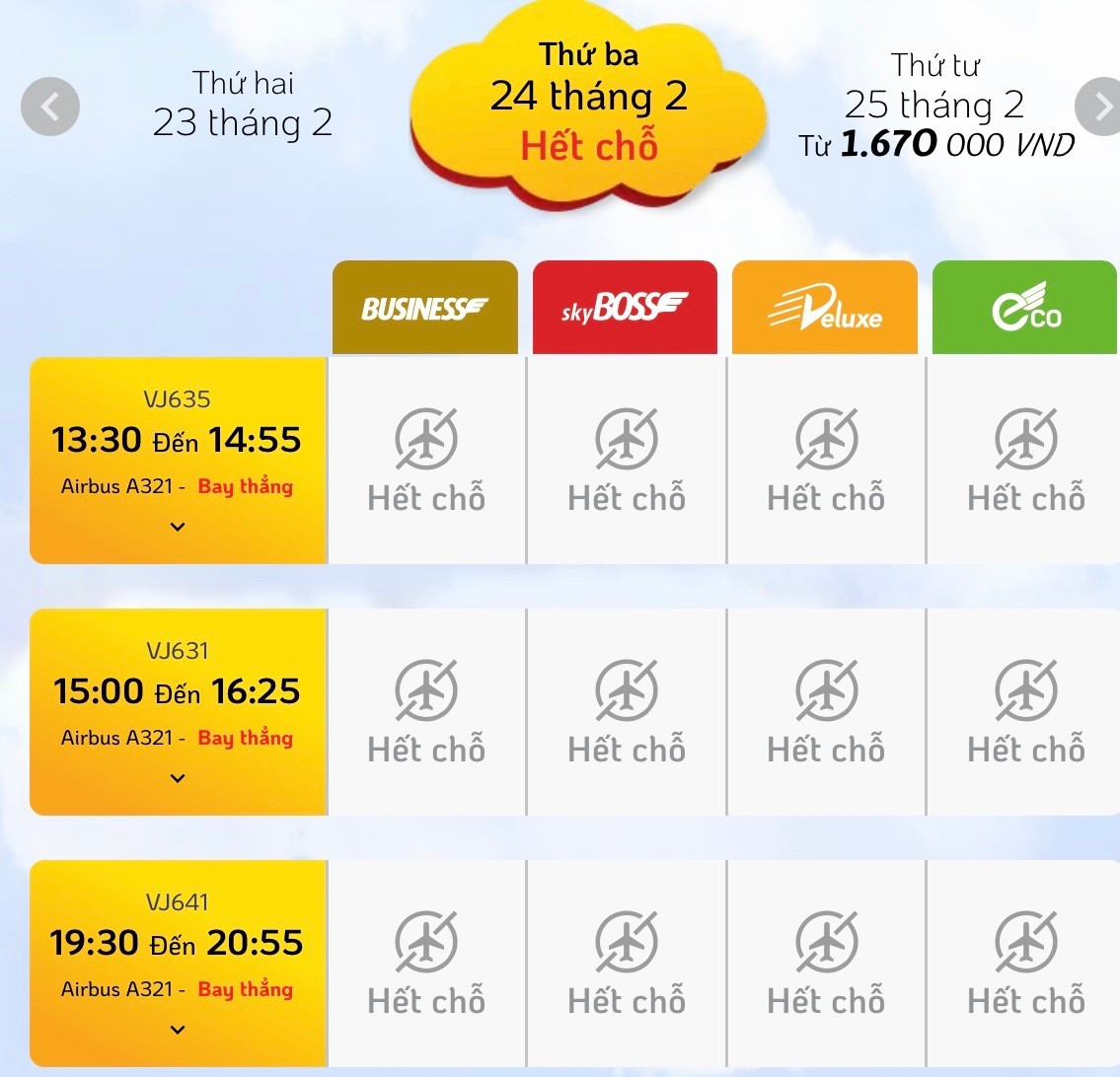 Chặng Đà Nẵng -TPHCM ngày 24/2 của Vietjet hiện không còn vé.