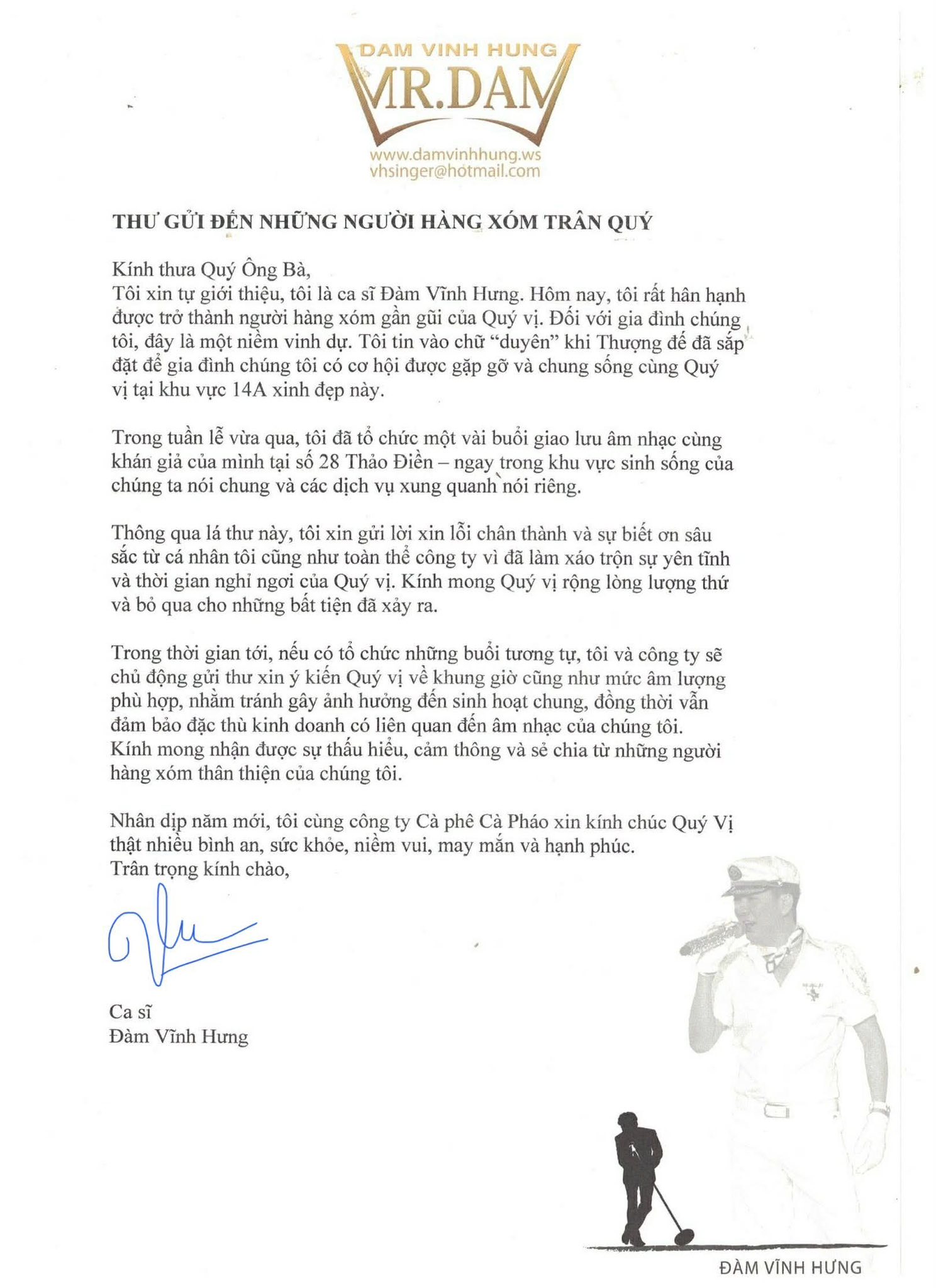 Ca sĩ Đàm Vĩnh Hưng gửi thư xin lỗi với những người hàng xóm