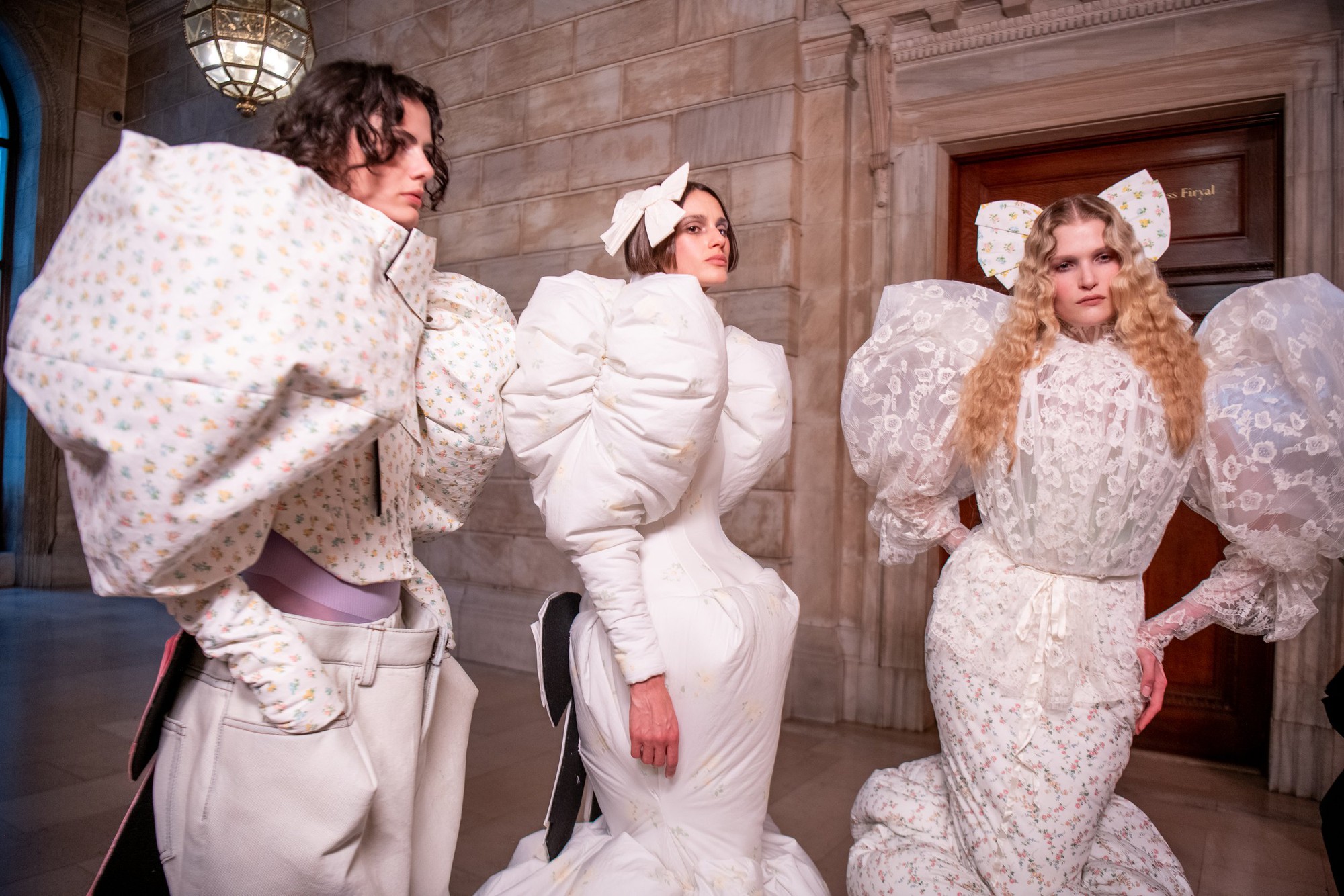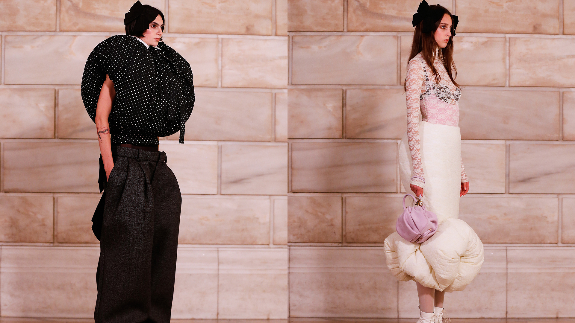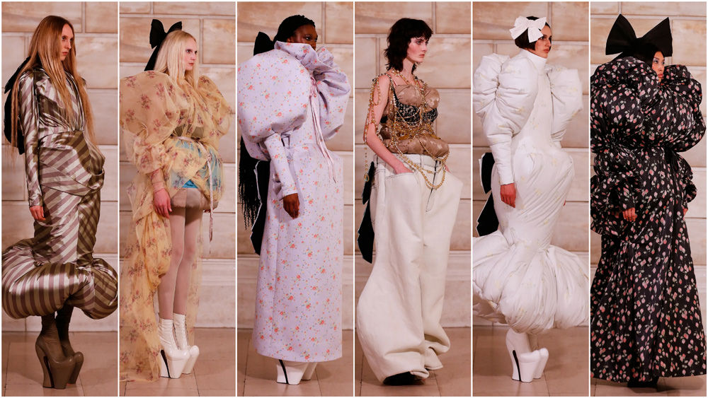 Tùng váy cao, tạo hình như một đài hoa ngược. Tà váy được xử lý vặn xoắn điệu nghệ, sử dụng đường may hoàn thiện nổi bật trông giống như vỏ gối lộn trái, kết hợp cùng sắc trắng thường ứng dụng trong đồ lót thời Victoria làm dấy lên những nghịch lý và phỏng đoán thú vị. Quý cô mang nơ trắng quá cỡ như búp bê sống, phải chăng cô đang chìm vào vải vóc bồng bềnh như đệm bông hay mây trắng?