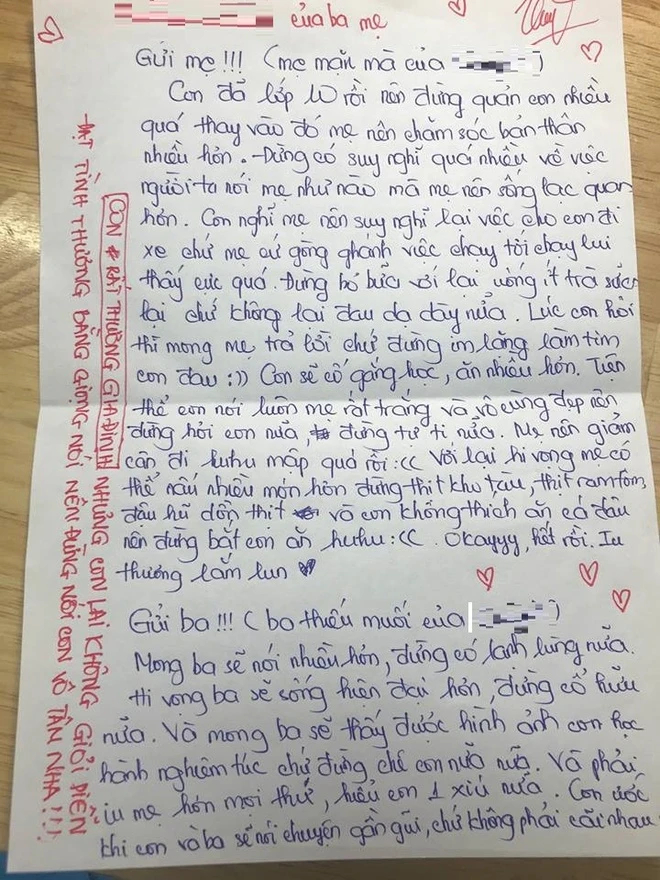 Không chỉ gửi mẹ, lá thư còn dành cho ba. Con mong ba nói nhiều hơn, cười nhiều hơn, sống hiền hòa hơn, bớt nghiêm khắc và bớt im lặng. Con mong ba nhìn thấy sự cố gắng của con, tin con, hiểu con, và khi con muốn tâm sự, đó là lúc ba lắng nghe chứ không phải là lúc để phán xét.