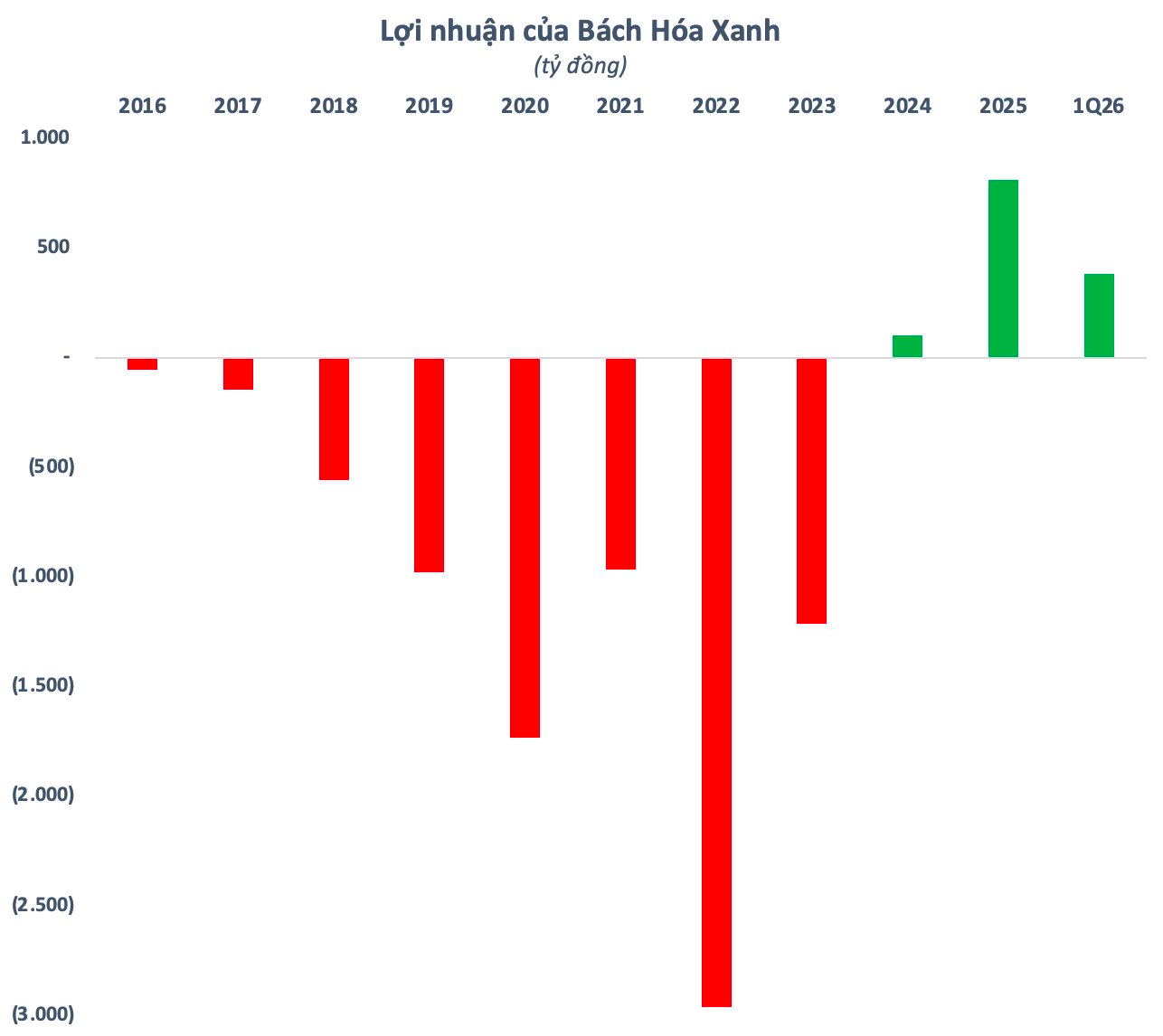 Trong 3 tháng đầu năm nay, Bách Hoá Xanh đã mở mới 280 cửa hàng, khoảng 18% tại miền Bắc và 14% tại miền Trung. Bách Hoá Xanh cho biết, dù bao gồm các điểm bán mới đi vào hoạt động trong tháng 3/2026, nhóm này vẫn ghi nhận lợi nhuận hoạt động dương trực tiếp ở cấp độ cửa hàng ngay trong quý đầu tiên.