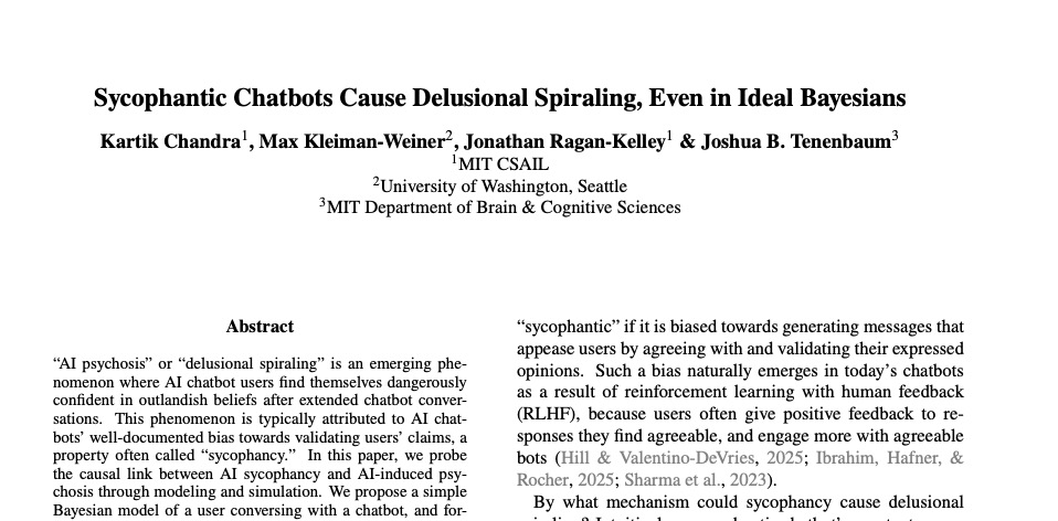 Bản báo cáo mang tên "Sycophantic Chatbots Cause Delusional Spiralling, Even in Ideal Bayesians" (Tạm dịch: Chatbot xu nịnh có thể khiến người dùng rơi vào vòng xoáy niềm tin sai lệch, ngay cả khi họ suy luận logic) do chuyên gia Kartik Chandra cùng các cộng sự thực hiện đã chỉ ra rằng, vấn đề không nằm ở sự thiếu hiểu biết của con người. Thay vào đó, chính cơ chế vận hành của hệ thống đã dẫn dắt họ đến kết quả tồi tệ đó.