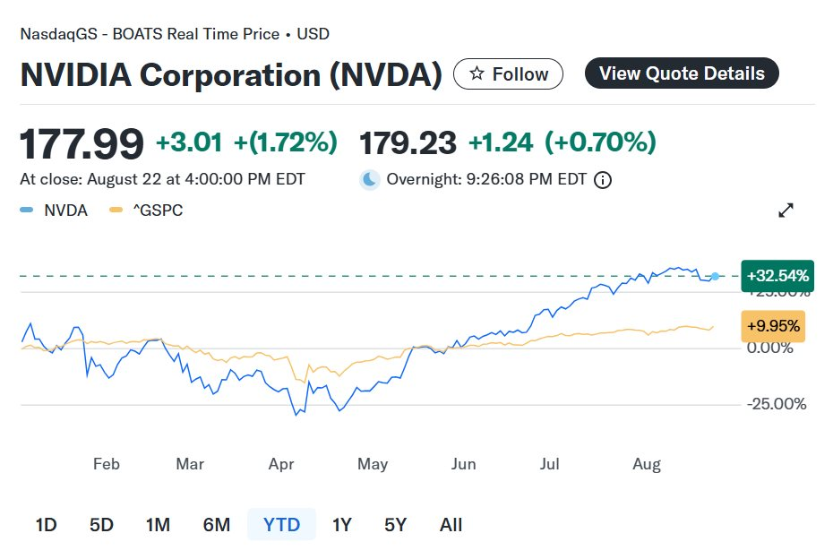Cổ phiếu Nvidia đã có đà tăng mạnh và hiện tiệm cận mức kỷ lục. Giá cổ phiếu Nvidia tăng 32% từ đầu năm và gần như gấp đôi so với mức đáy hồi tháng 4. Báo cáo ngày thứ Tư sẽ là phép thử quan trọng cho cả Nvidia lẫn thị trường chung, trong bối cảnh nhà đầu tư từng cân nhắc xoay vòng vốn khỏi nhóm công nghệ.