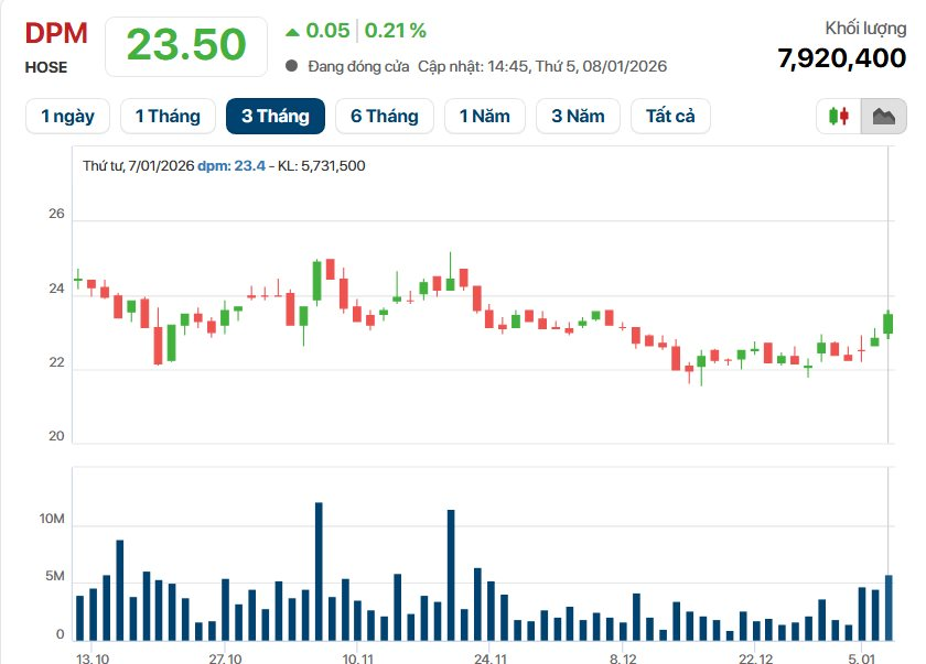 Trên thị trường, cổ phiếu DPM đang giao dịch quanh vùng giá 23.500 đồng/cổ phiếu. Tính theo mức giá này và kế hoạch cổ tức 1.200 đồng, tỷ suất lợi tức (dividend yield) dự kiến khoảng 5,1%.