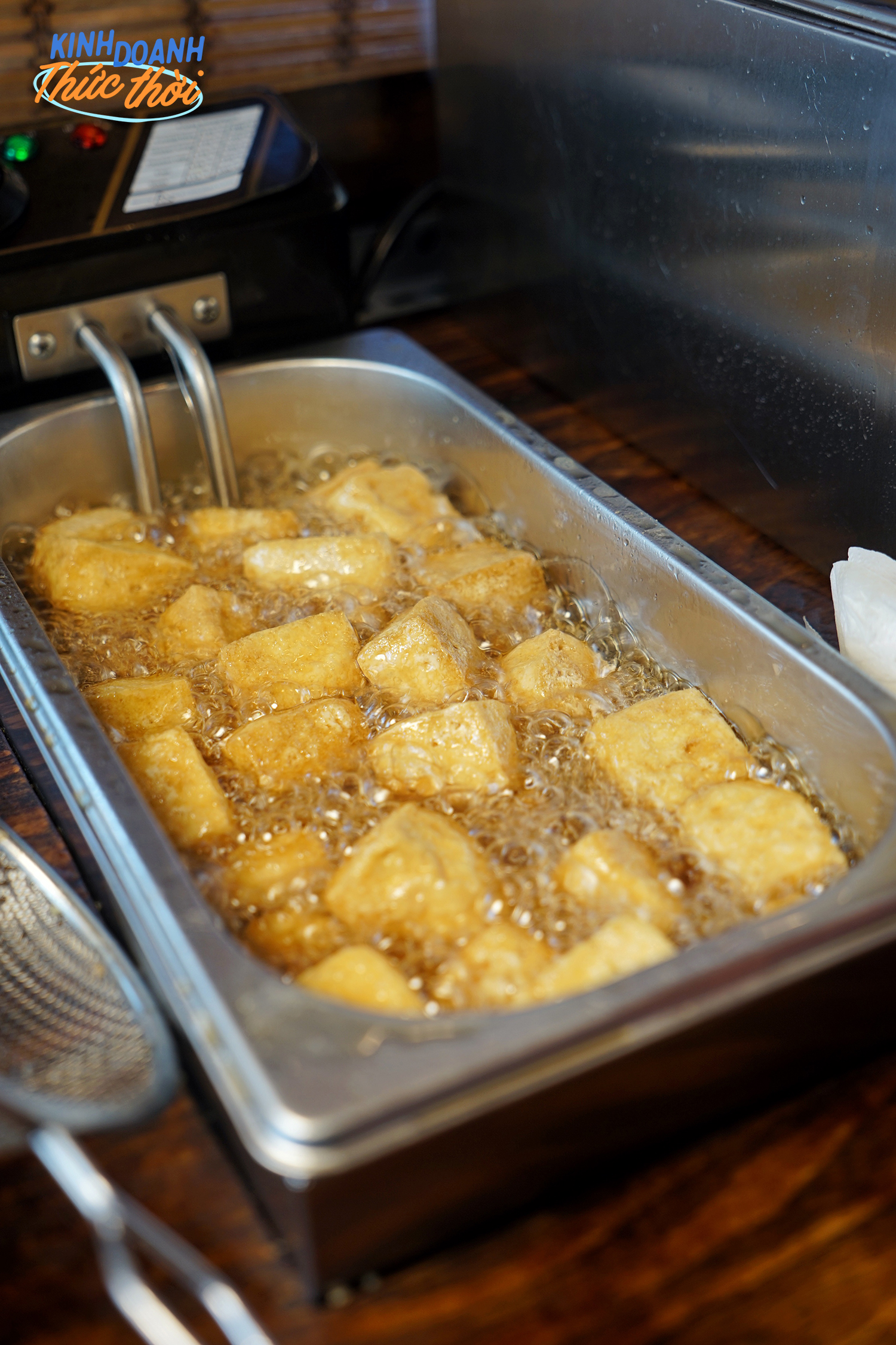 Khu vực chiên đậu bị hạn chế không gian vì sợ bay mùi, ống hút mùi được lắp ngay trên khu vực chiên.